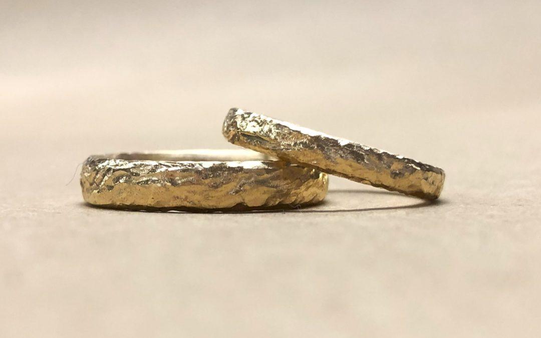 Gemusterte Eheringe mit Struktur wie Wurzelholz aus Gold vom Goldschmied Walnussmuster von Susanne Krist | Apr. 27, 2024
