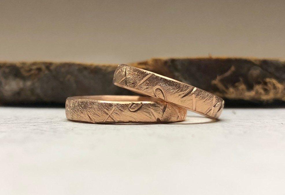 Rotgoldringe mit Herzen als Eheringe mit Kerbholzmuster