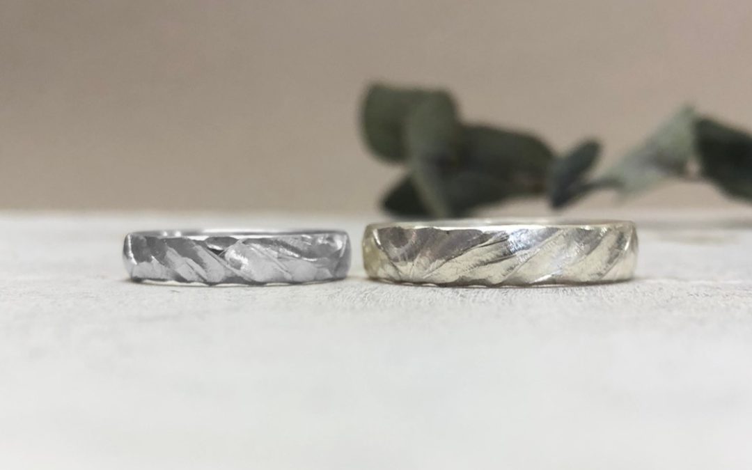 Weissgold und Platin Ringe stark gemustert geschmiedet mit Buchtstruktur von Susanne Krist | Juni 23, 2024