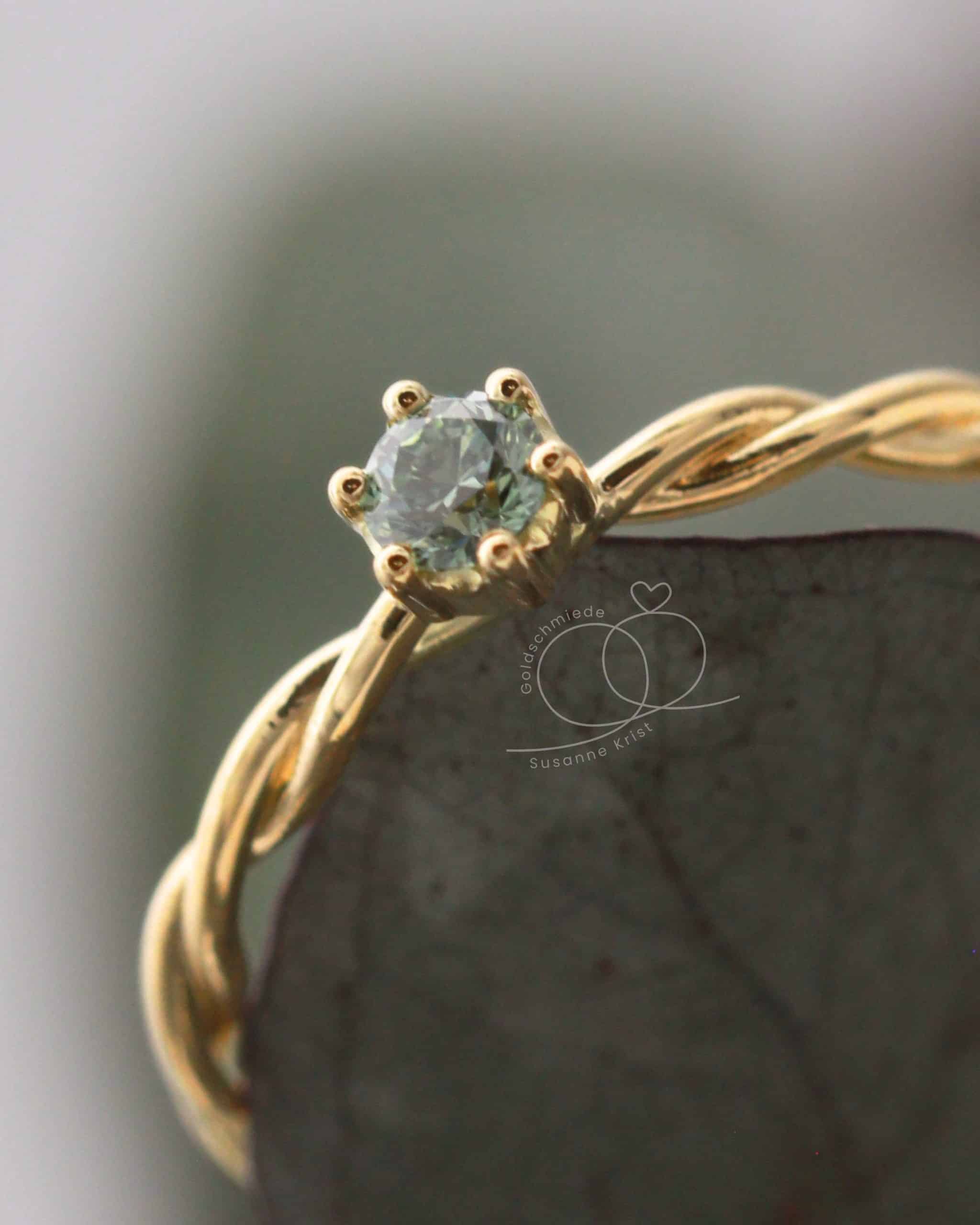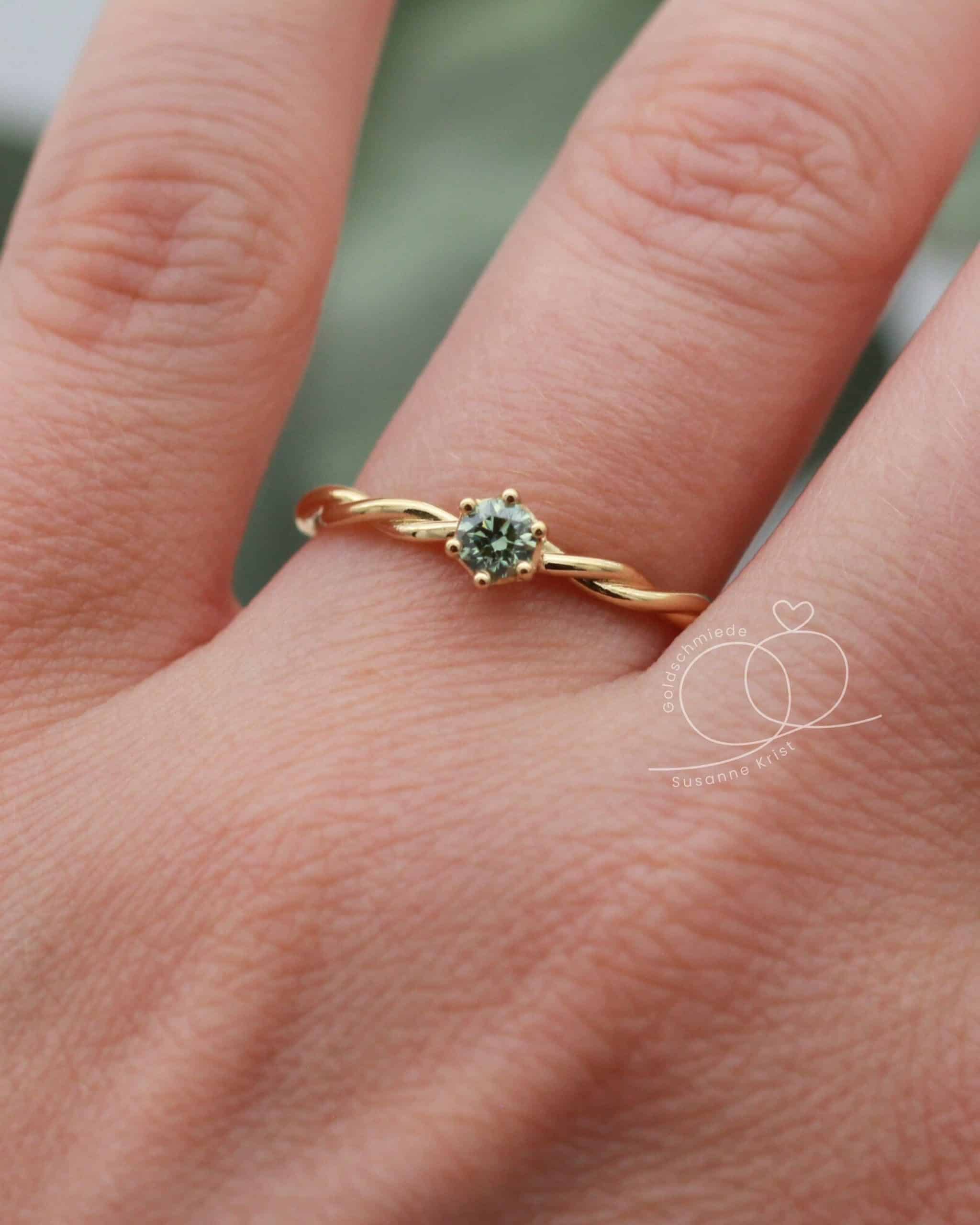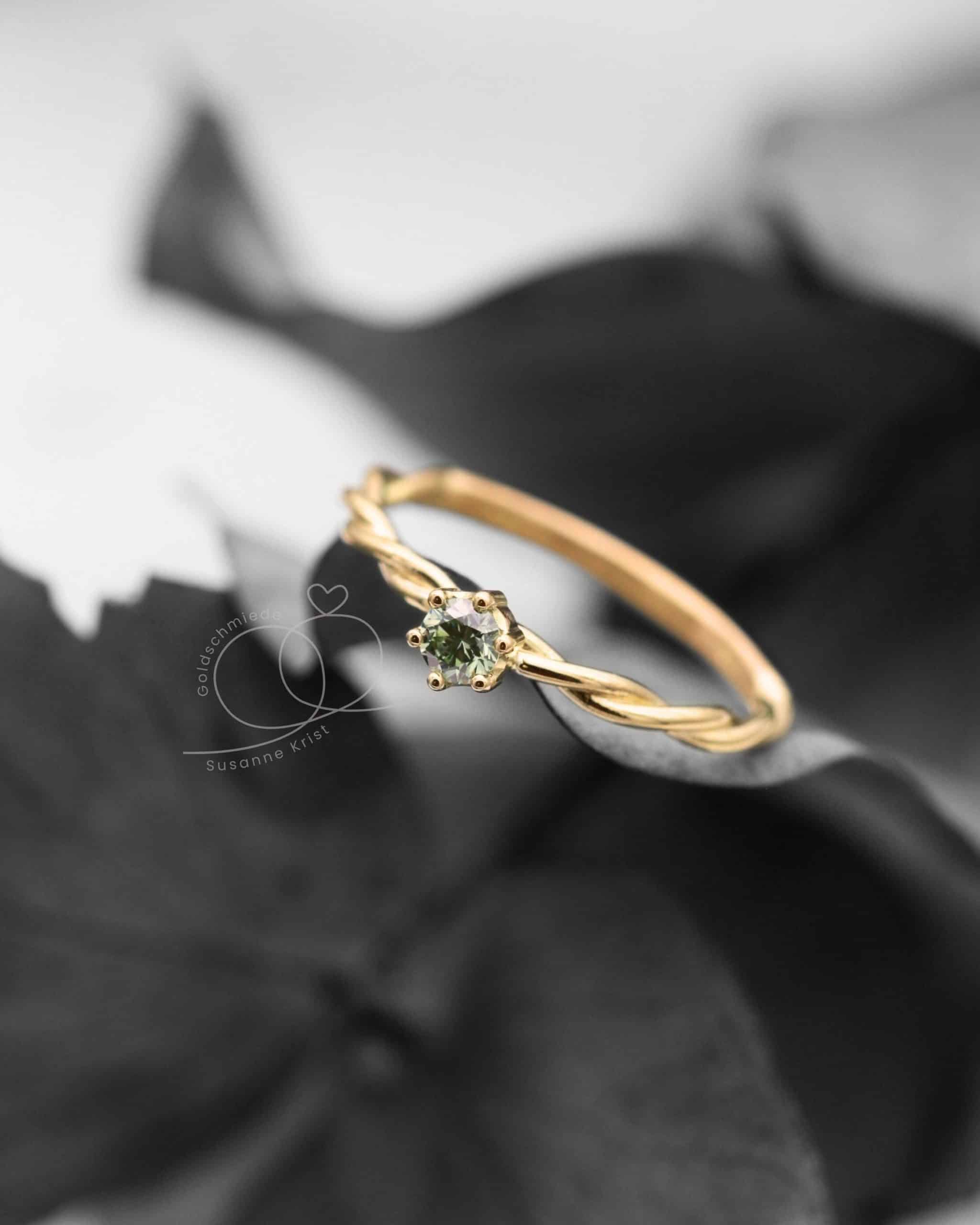 Du wünscht dir einen kleineren Stein oder statt eines grünen Diamanten lieber einen grünen Turmalin oder Safir? Mit Turmalin würde der Ring preislich günstiger werden. Oder hättest du den Ring gerne lieber in Weißgold? Schreib mir gerne und ich mache dir ein individuelles Angebot.