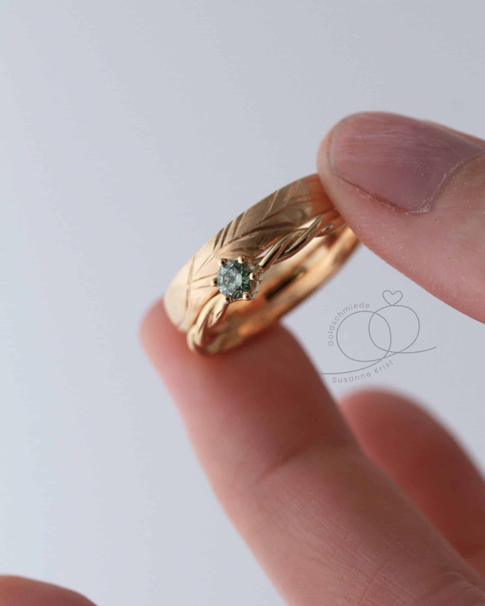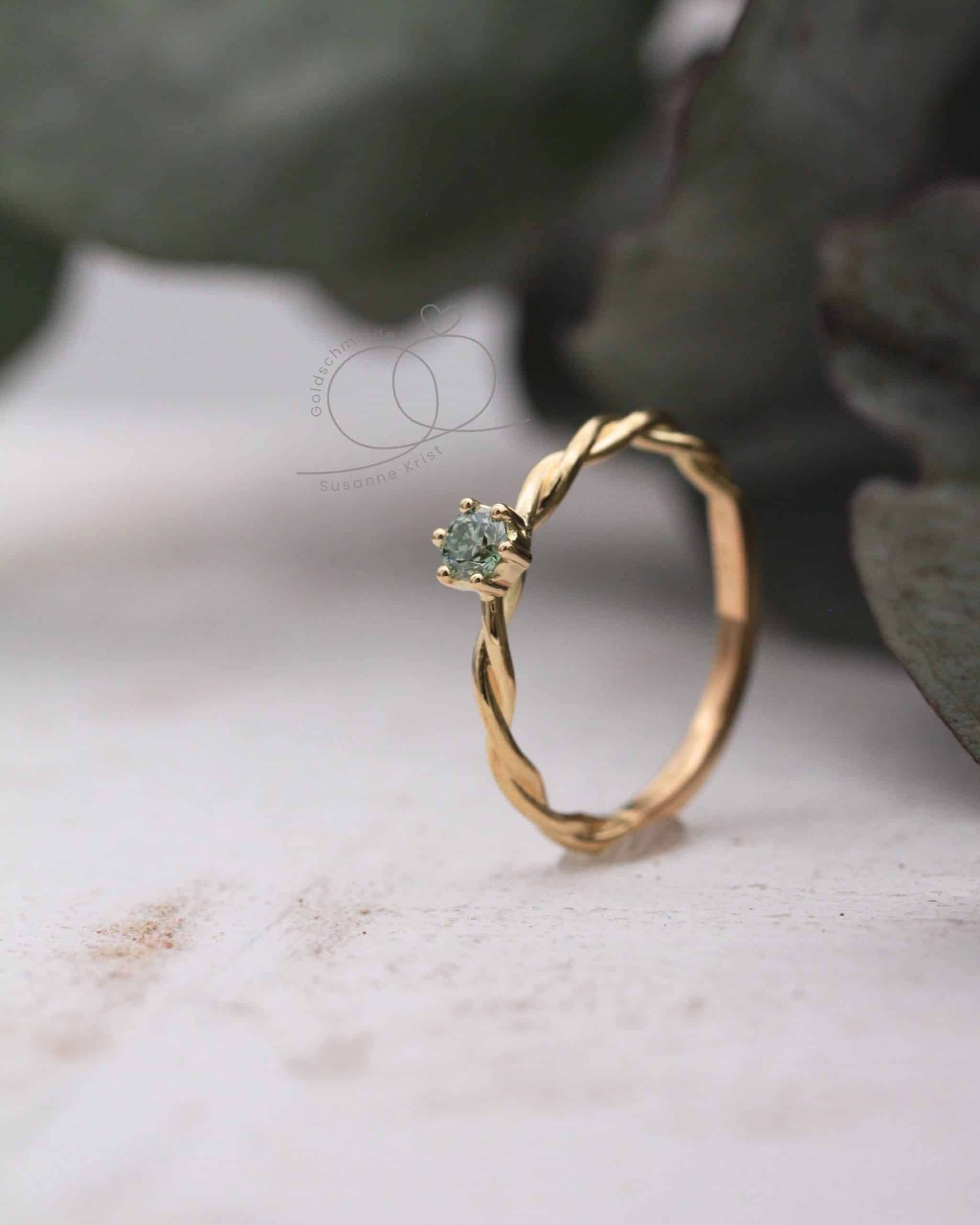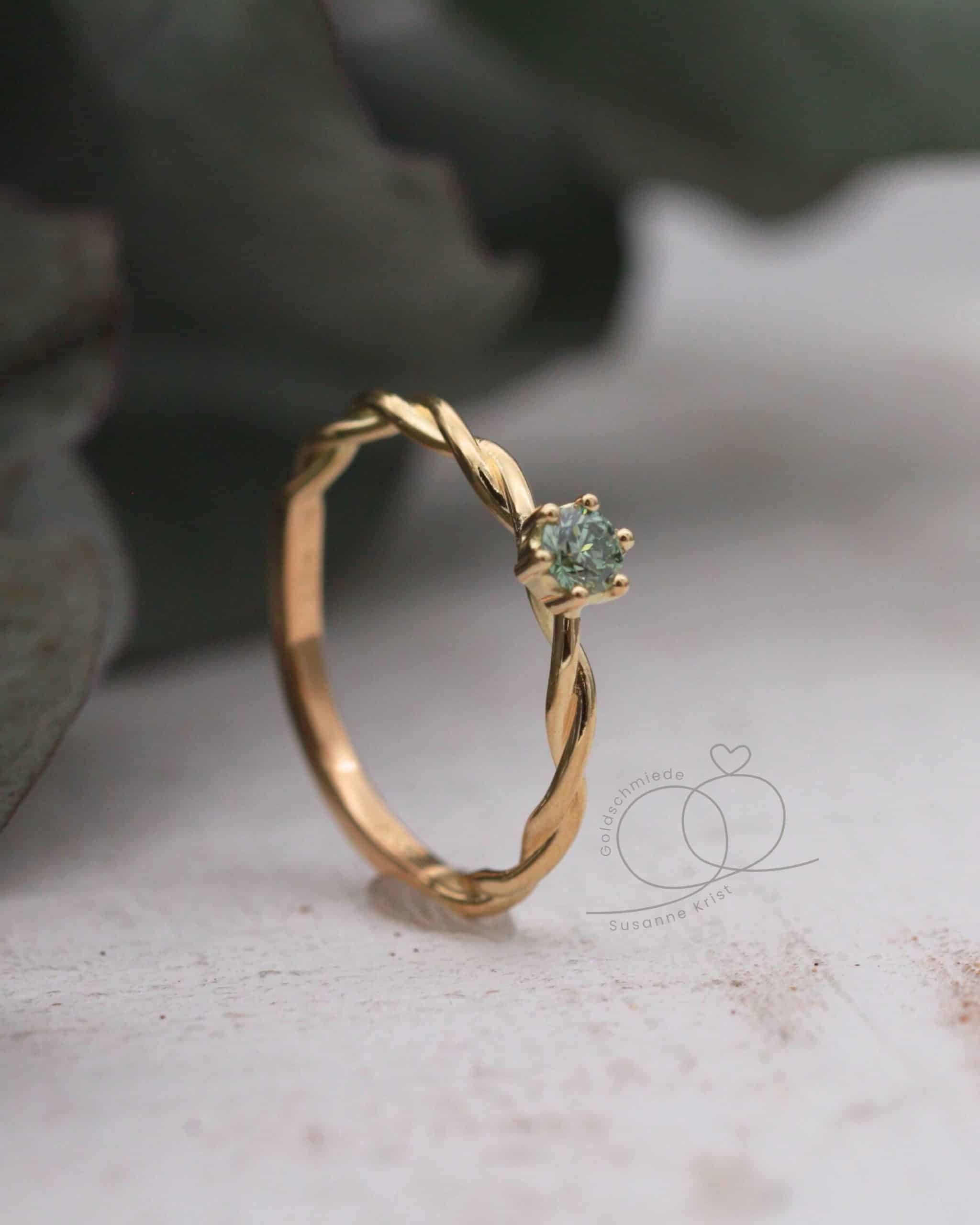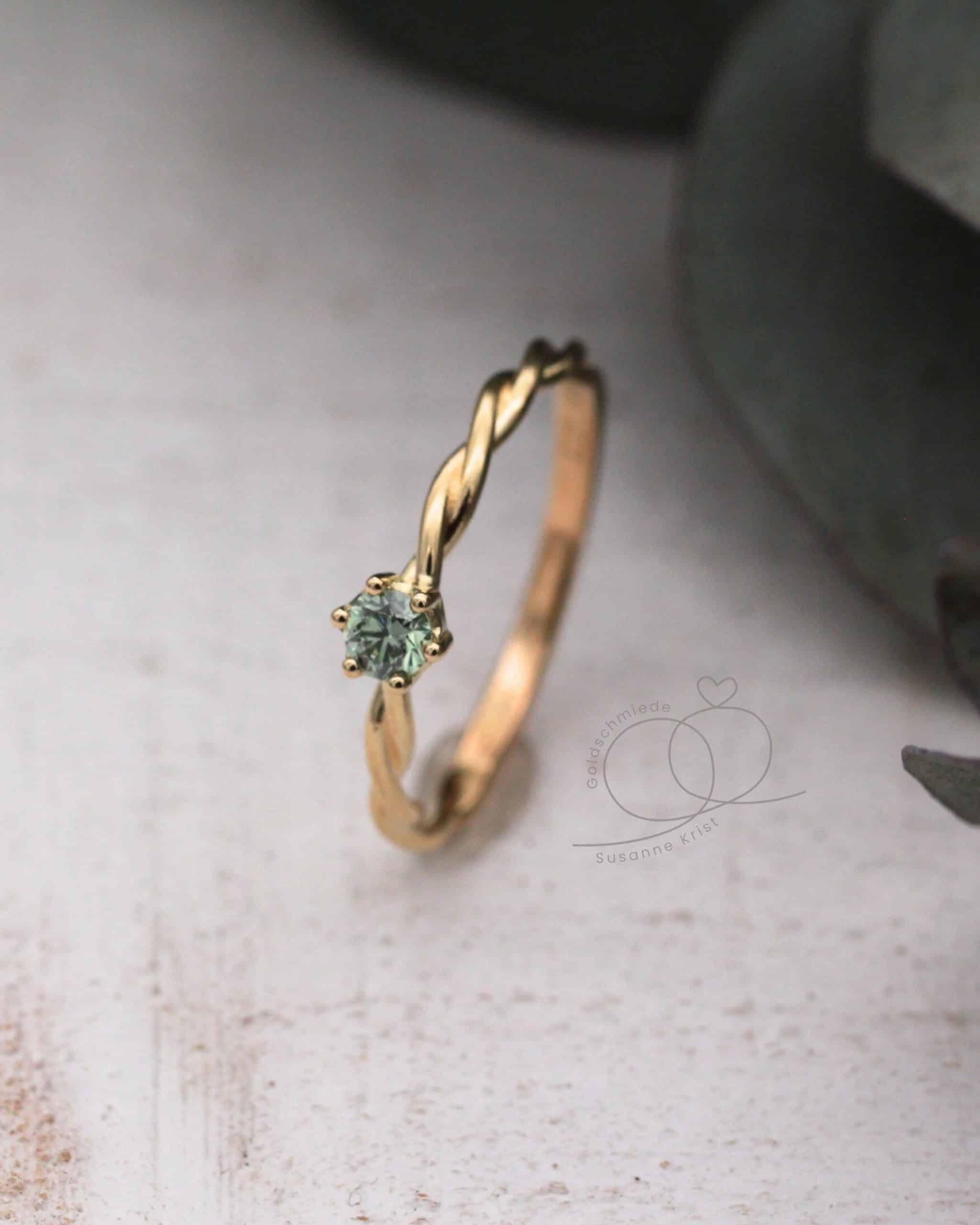 Du wünscht dir einen kleineren Stein oder statt eines grünen Diamanten lieber einen grünen Turmalin oder Safir? Mit Turmalin würde der Ring preislich günstiger werden. Oder hättest du den Ring gerne lieber in Weißgold? Schreib mir gerne und ich mache dir ein individuelles Angebot.