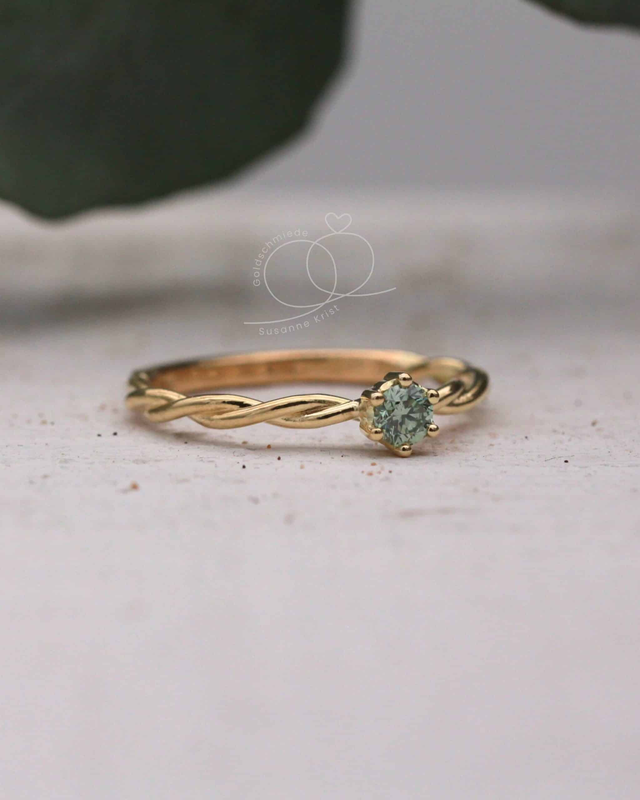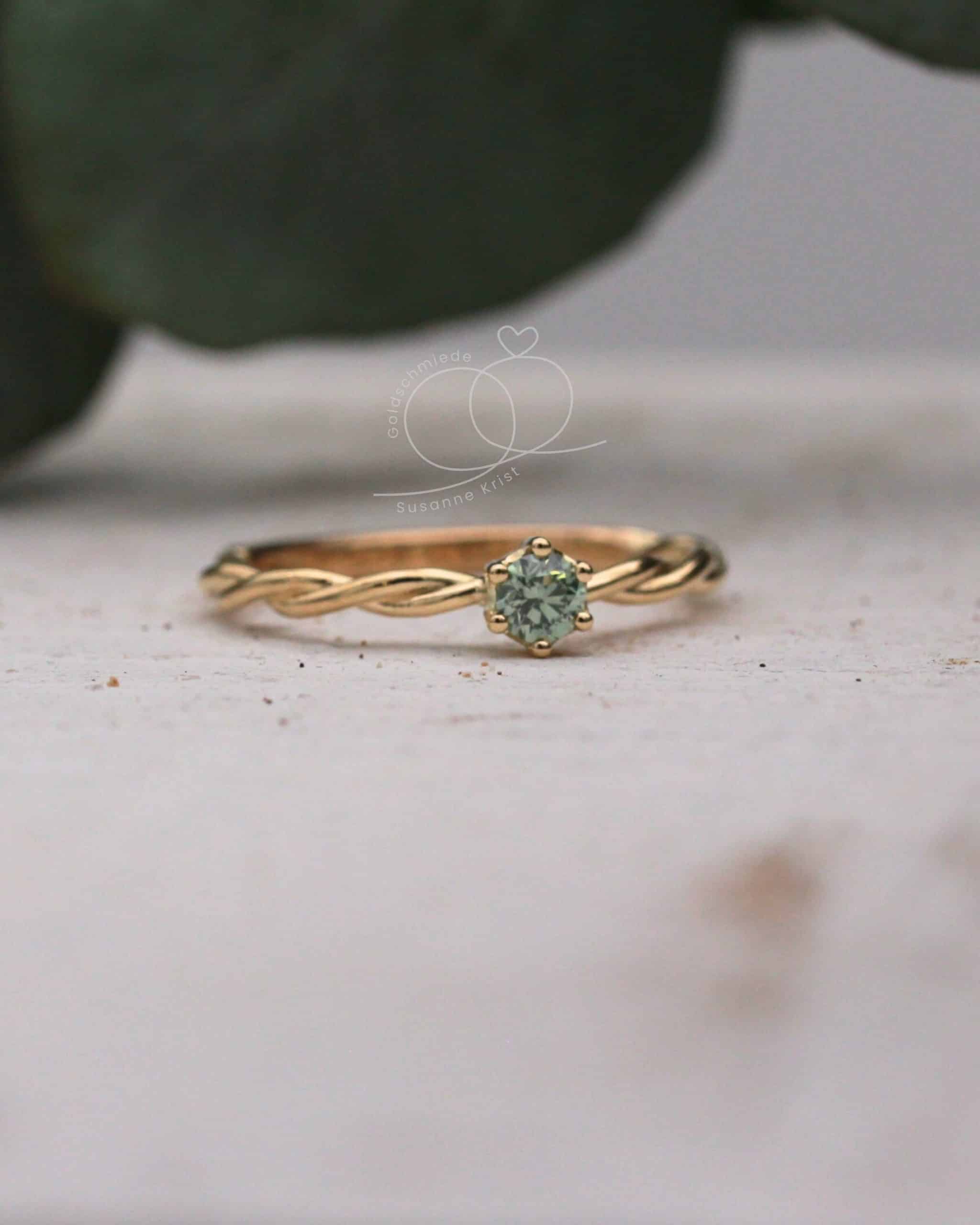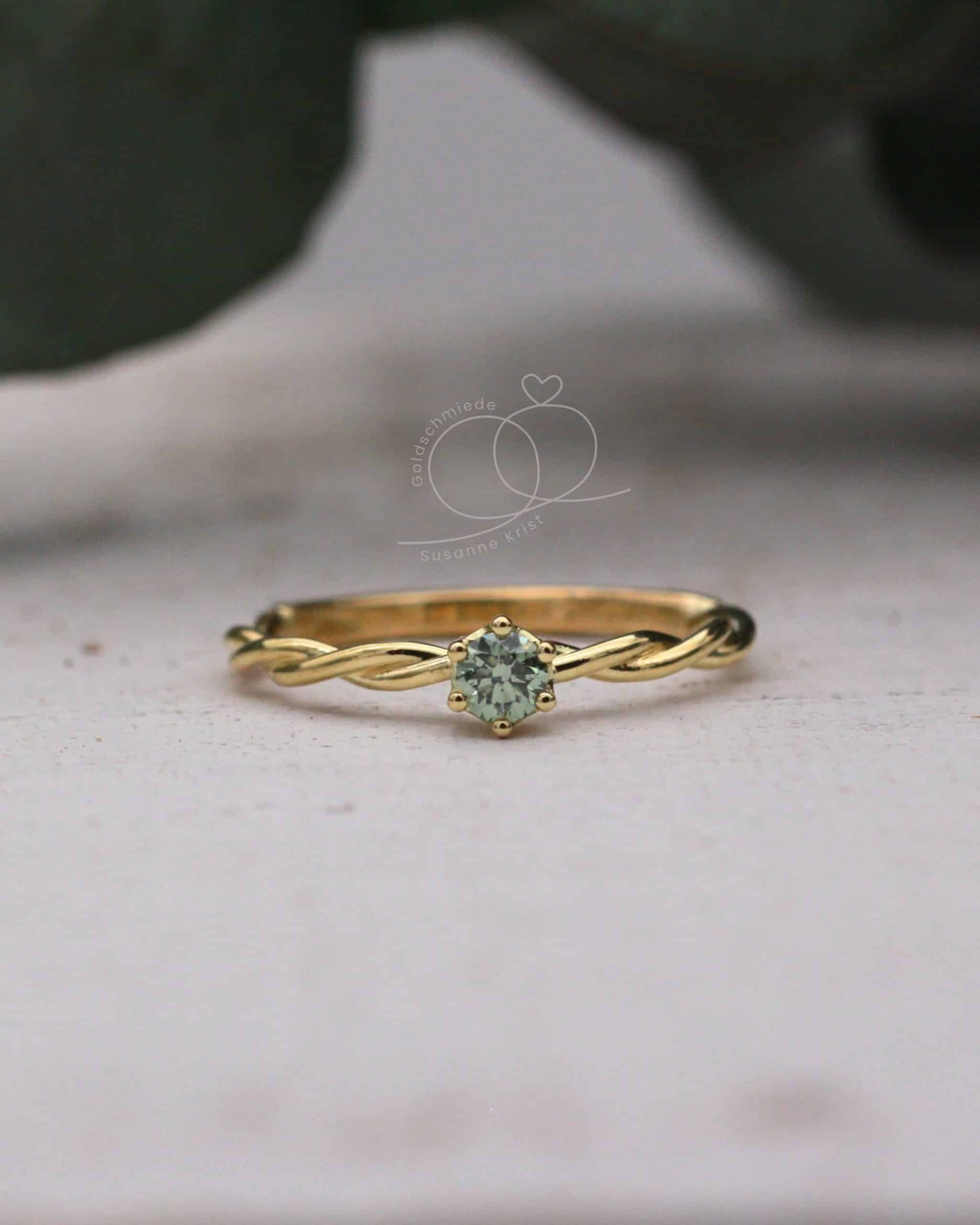 Bria ist ein absoluter Traumring. Er ist ein eleganter Kordelring, der von einem ganz besonderen hellgrünen Diamanten gekrönt wird. Lies weiter, wenn du mehr über Goldring grüner Stein „Bria“ erfahren möchtest.