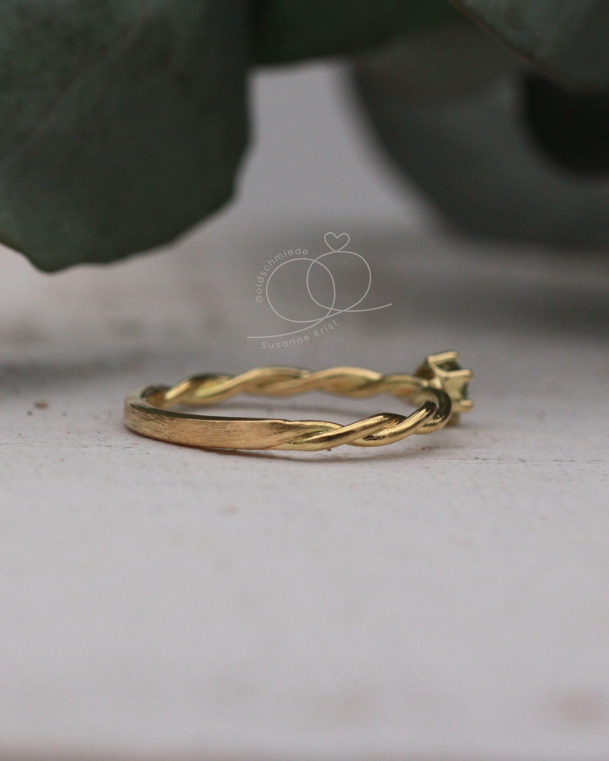 Der Ring besteht oben aus einer 2 mm Kordel und unten aus einem 2 mm breiten und ca. 1,8 mm starken Goldband. Kleine Abweichungen sind natürlich normal, weil der Ring handgefertigt wird.