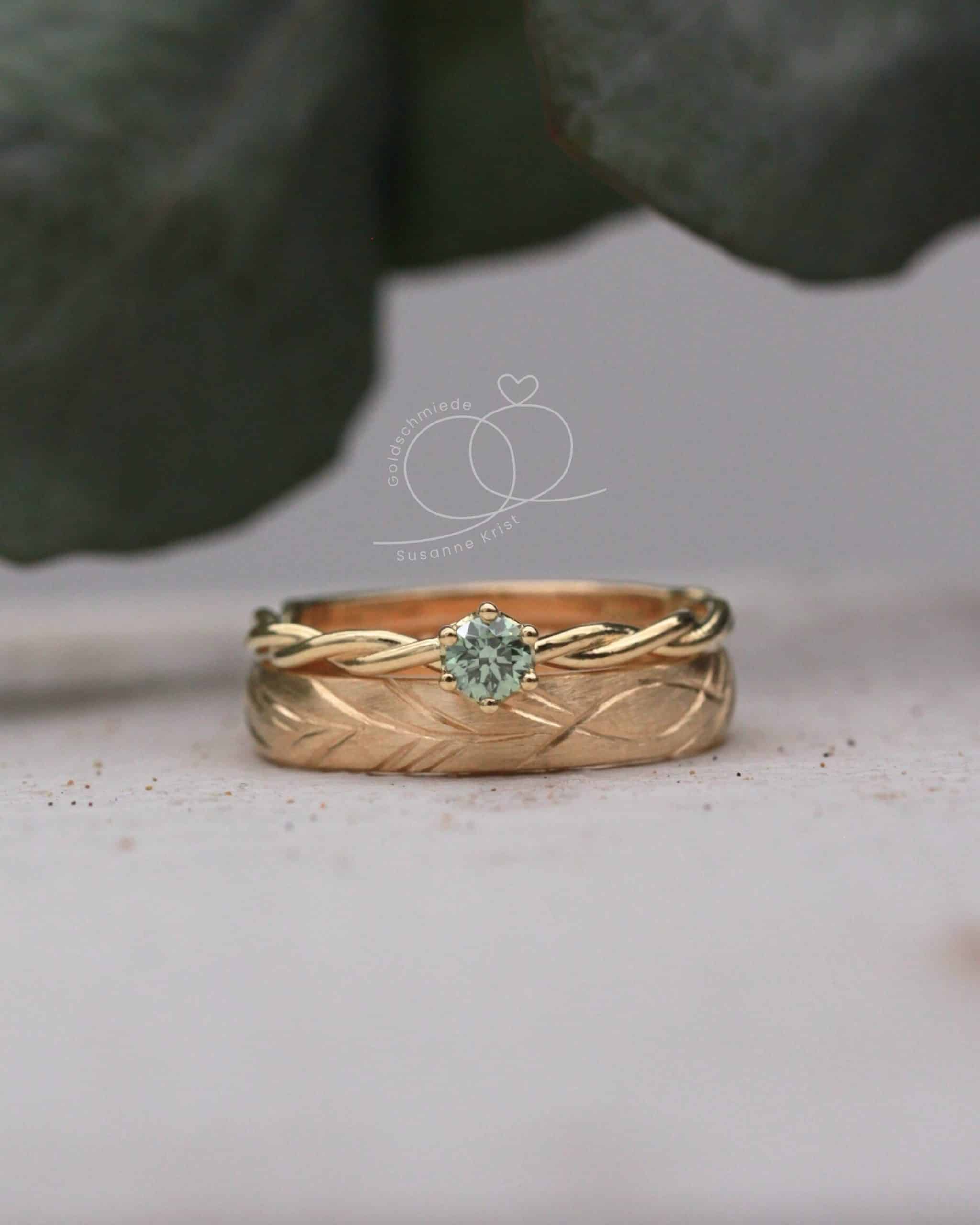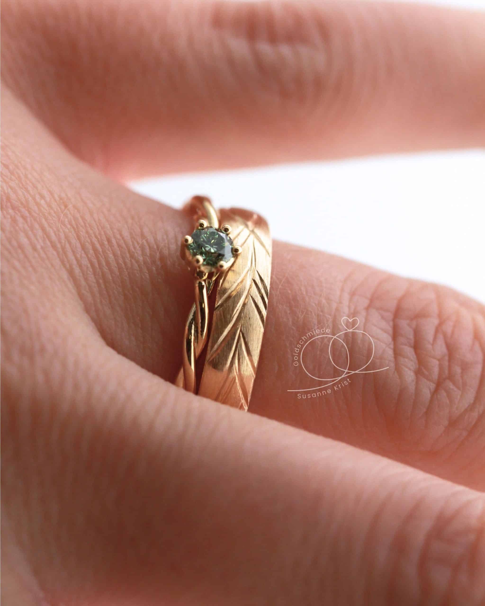 Einfach total schön in Kombination: Der Goldring grüner Stein „Bria“ ist auch ein sogenannter Vorsteckring. Das heisst, der Ring kann wenn gewünscht, am selben Finger wie der Trauring getragen werden. Wie schön das aussieht, siehst du unten. Egal ob er kombiniert getragen oder alleinig an einem Finger sitzt, es sieht einfach toll aus. Ich bin ganz begeistert.