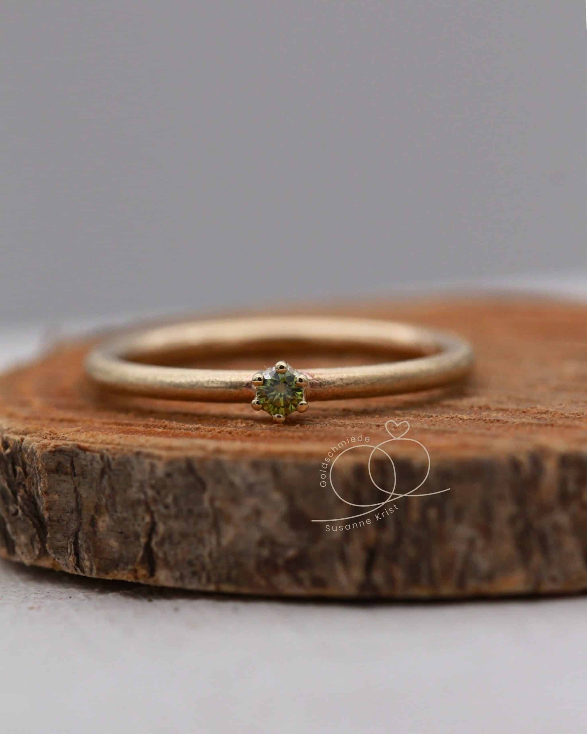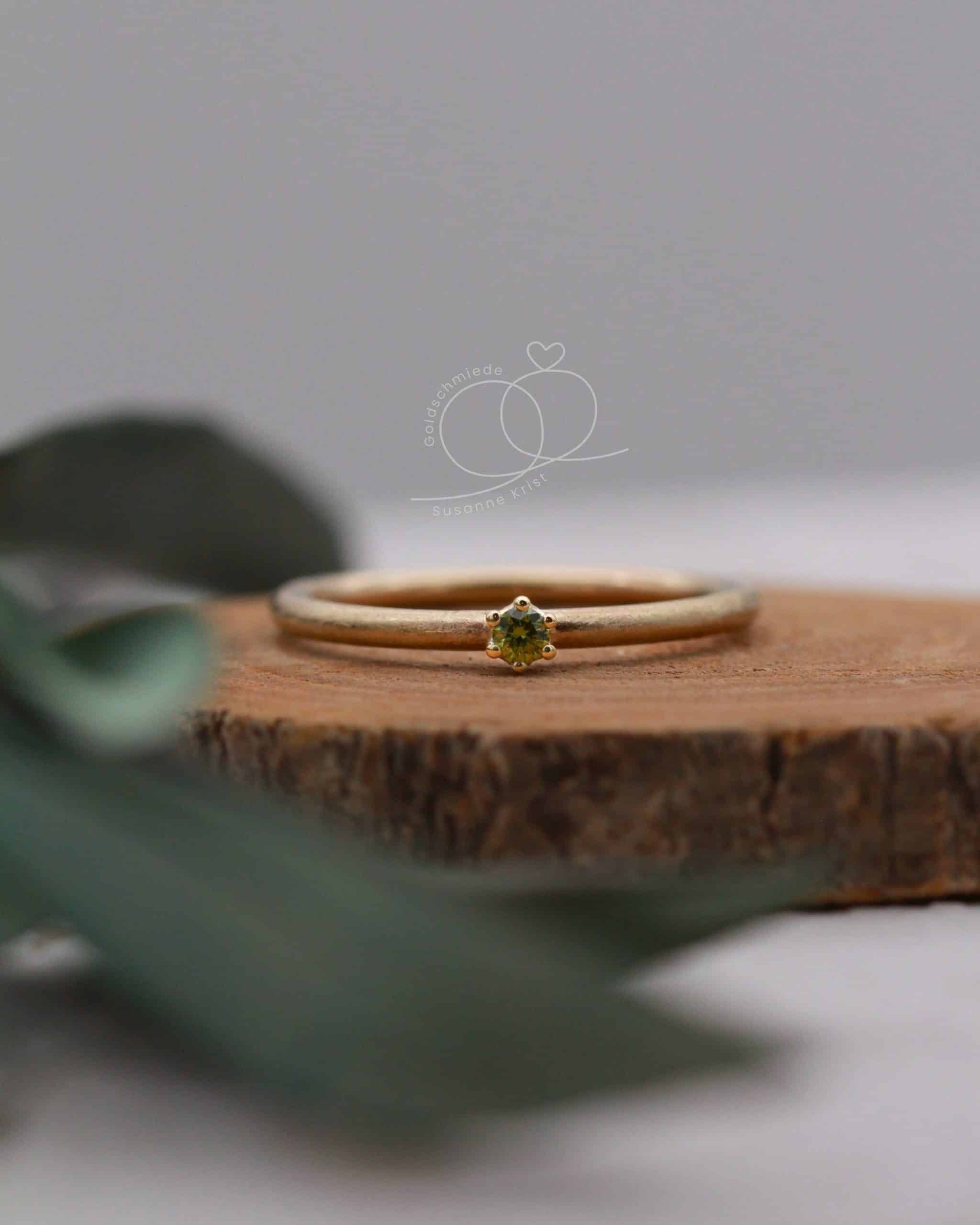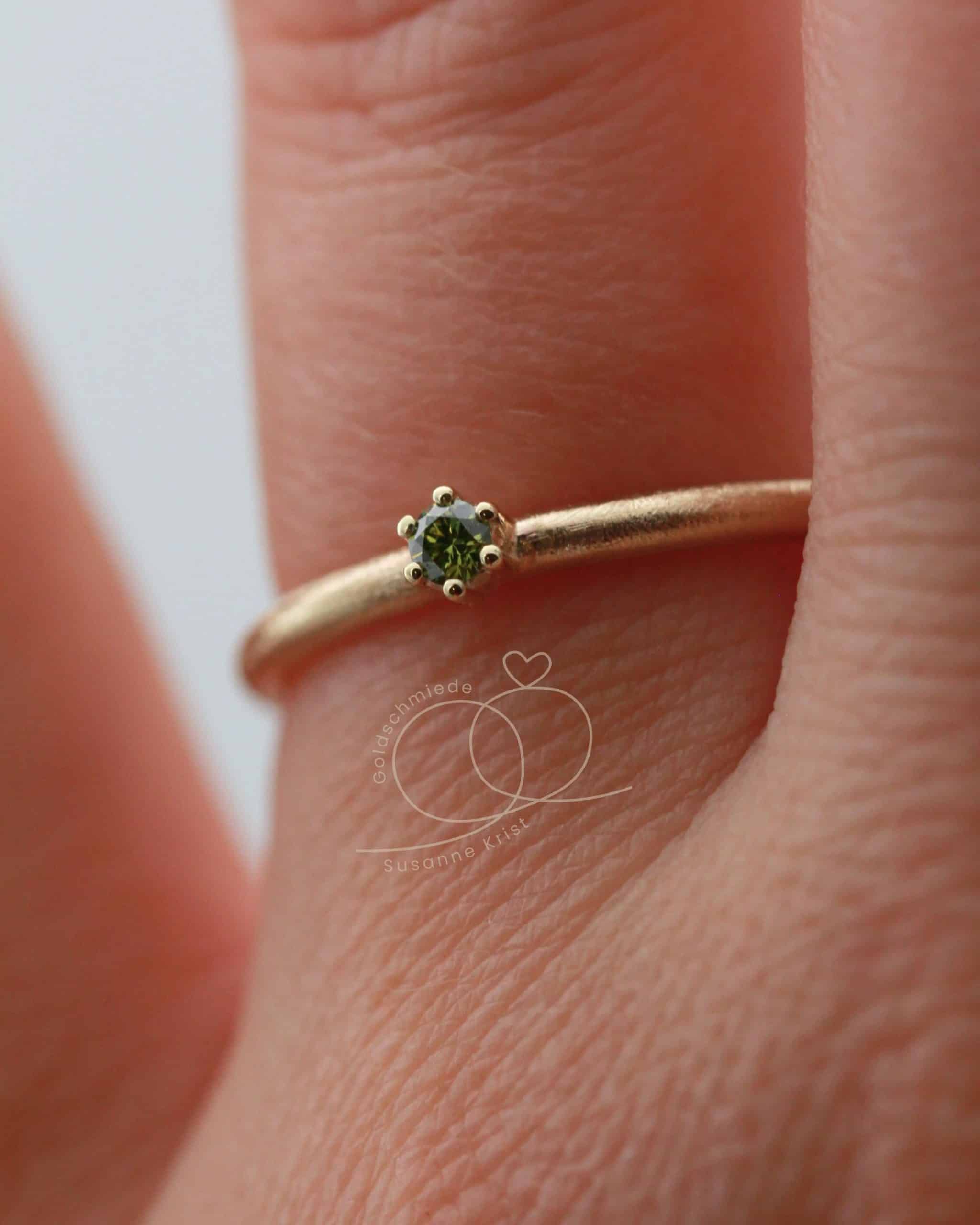 Der Stein ist ein kleiner Hingucker. Ein glitzernder, olivgrüner Diamant, auch Brillant genannt, sitzt in einer eleganten Krallenfassung mit 6 kleinen Ästen.