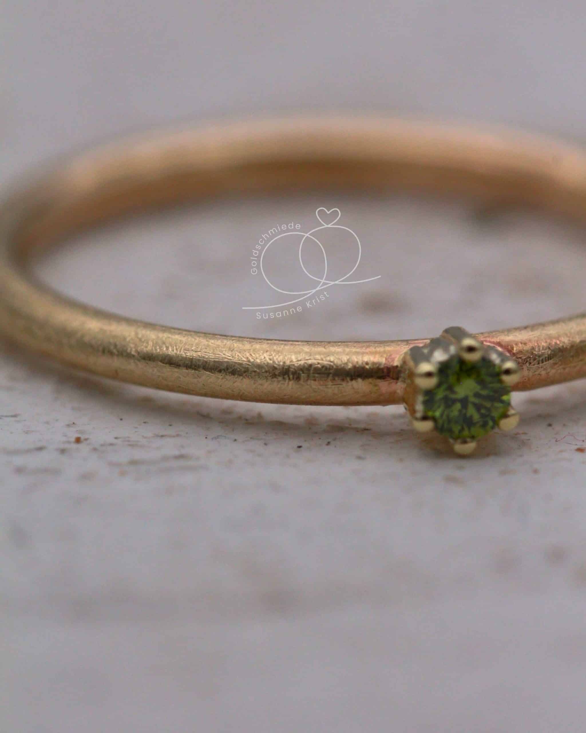 Jetzt kommt der Clue: Fini Oliv ist ein Vorsteckring. Das ist ein Ring, der auch an anderen Ringen getragen werden kann. Damit ihr den Ring mit grünem Stein später auch in Kombi mit einem Trauring tragen könnt, haben wir die Fassung so platziert, dass ein weiterer Ring später dazu kombiniert werden kann. Einfach der Hammer! Nachfolgend siehst du, wie toll das aussieht.