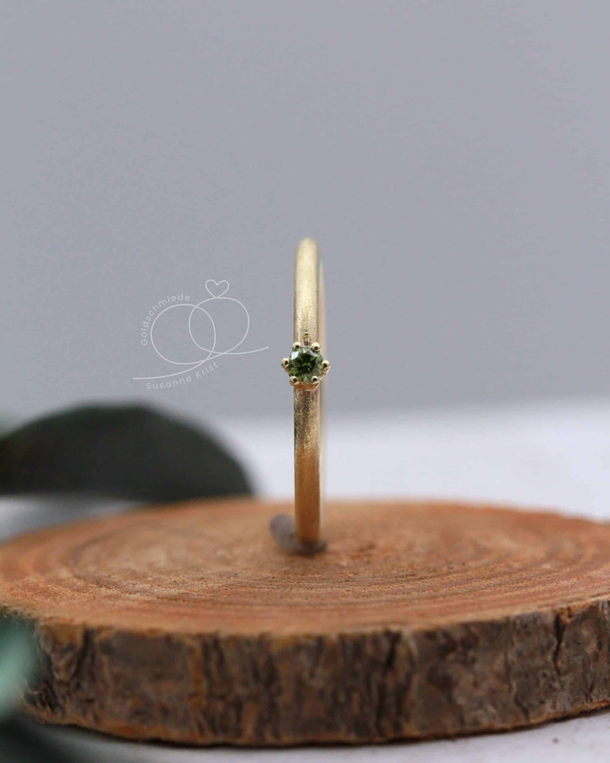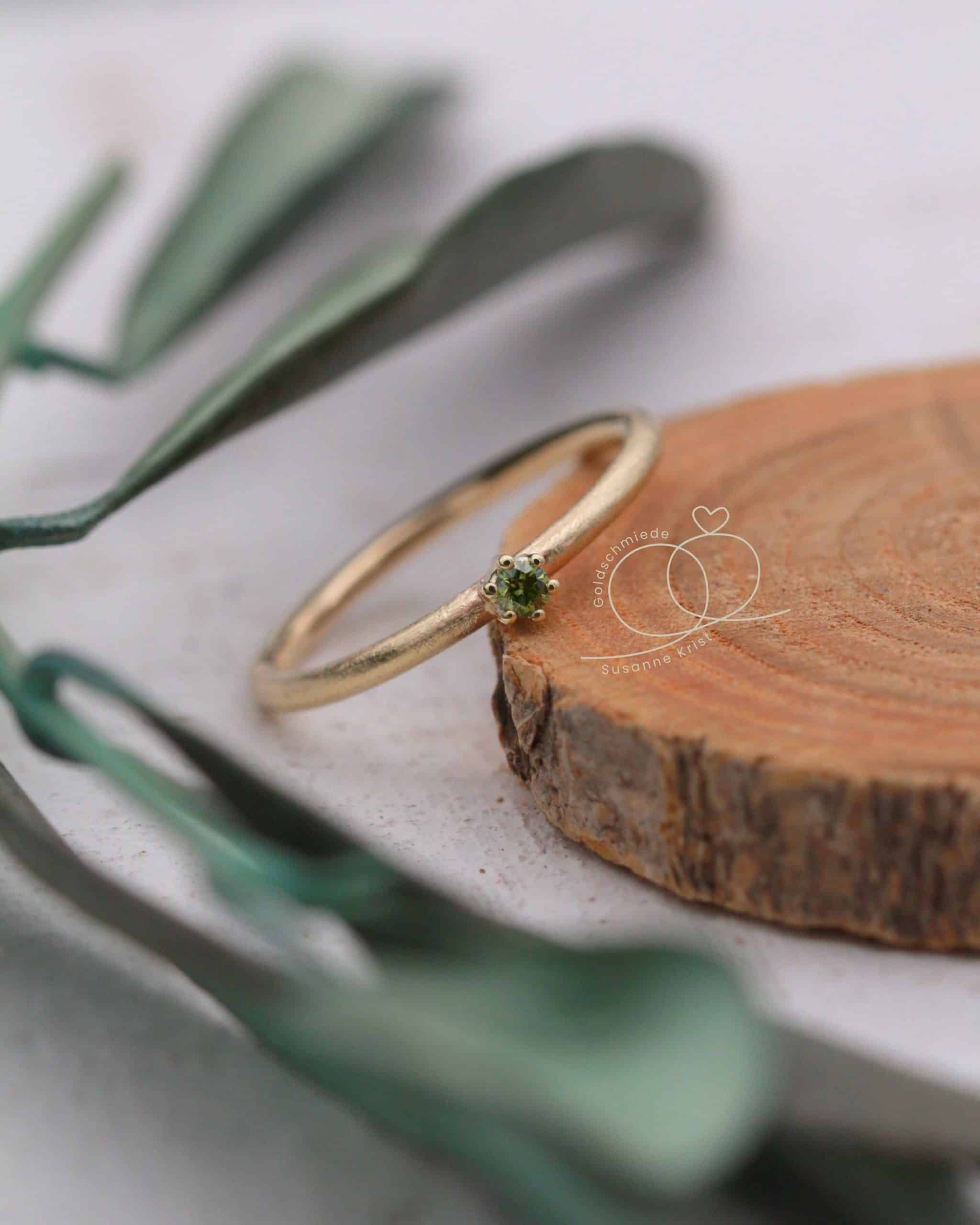 Der schlichte Ring grüner Stein hat eine eismatte Oberfläche. Die Oberfläche ist sanft bearbeitet, sodass auf dem Ring ein ein leichtes Glitzern entsteht. Wir arbeiten sie mit verschiedenen Werkzeugen in unserer Ringmanufaktur ein. Die Goldfarbe wird so wunderbar betont. Die Oberfläche ist jedoch sanft, nicht kratzig und lässt sich angenehm auf der Haut tragen.