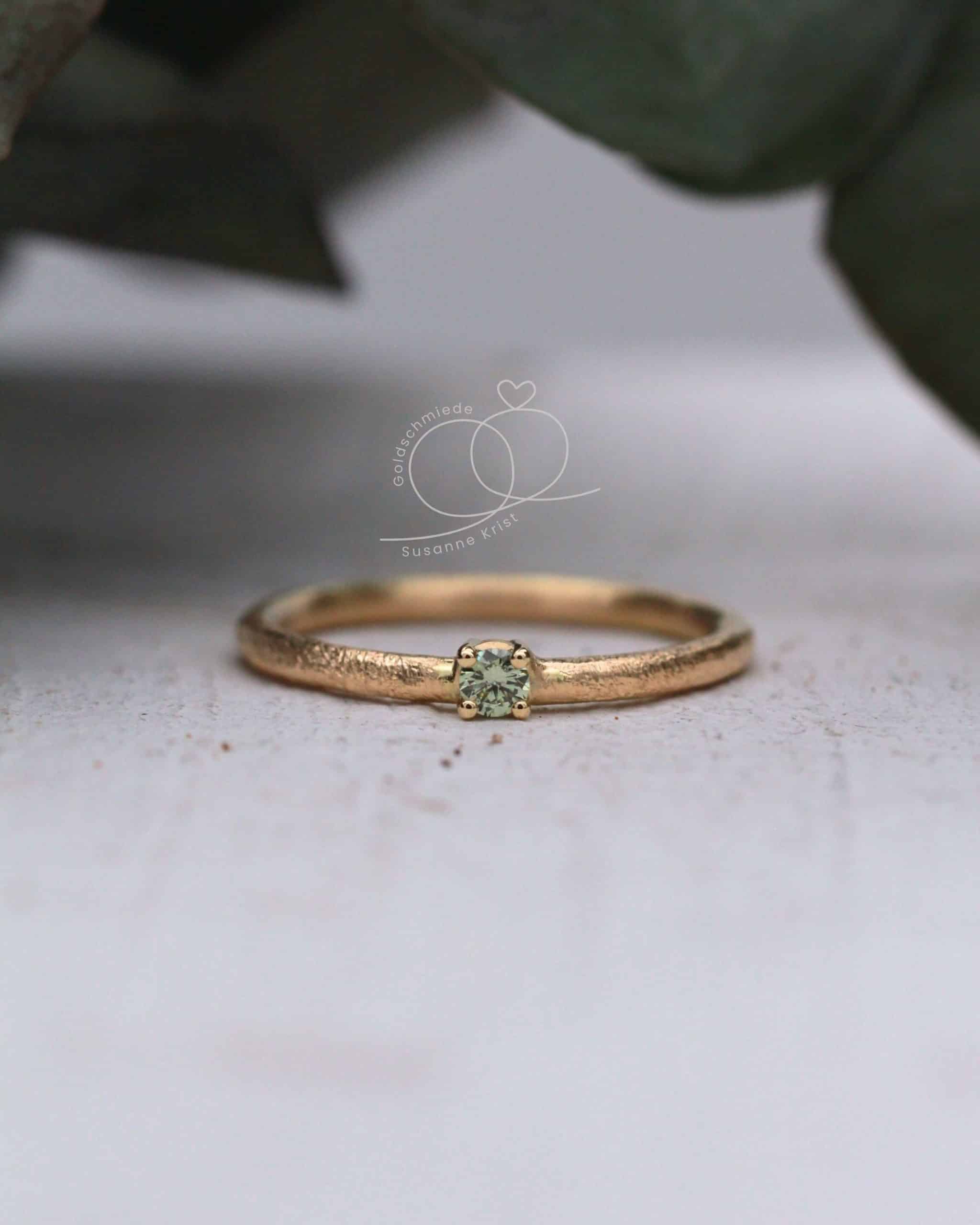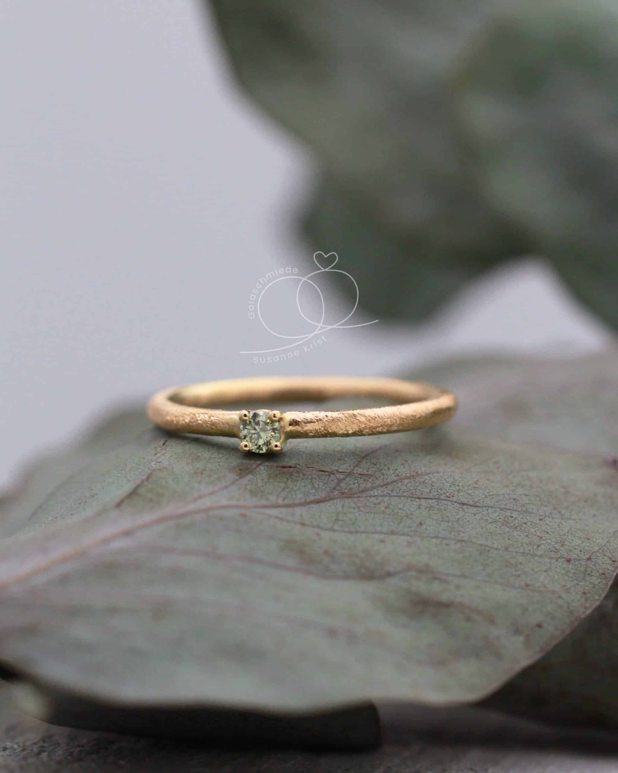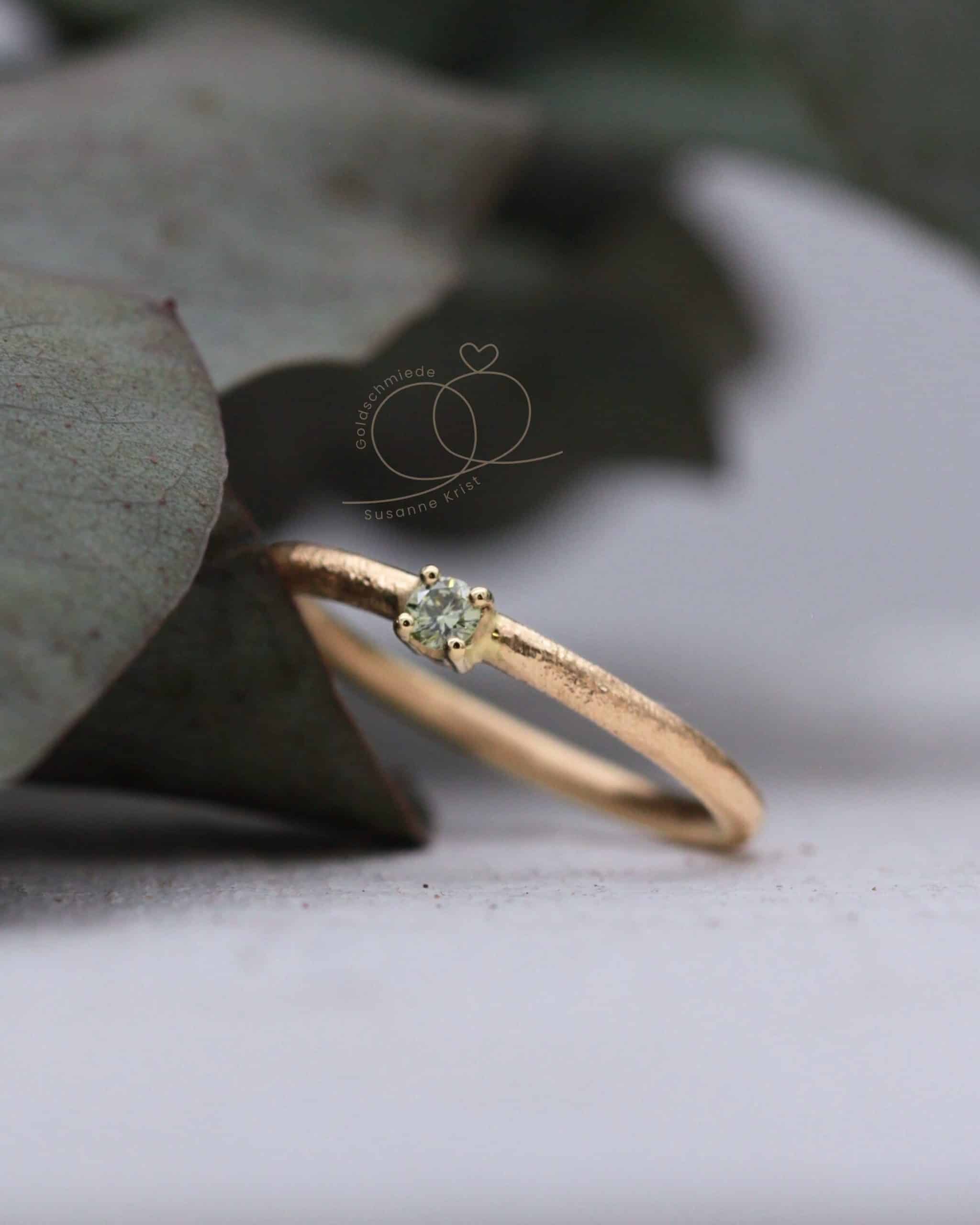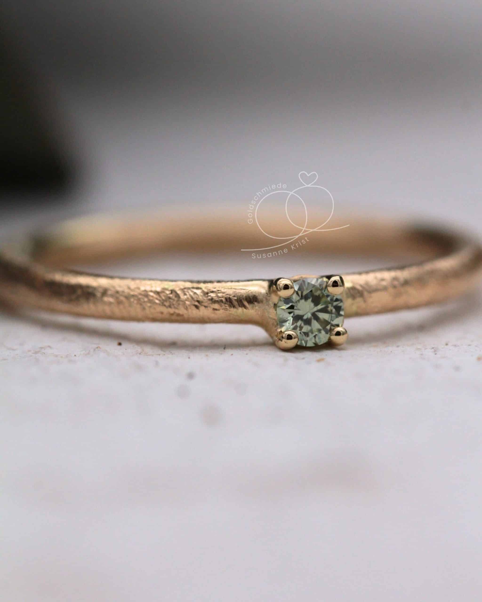 Ein glitzernder, hellgrüner Diamant, auch Brillant genannt, sitzt in einer Fassung mit 4 kleinen Ästen. Der minzgrüne Farbton ist etwas ganz Besonderes. Du hast die Wahl zwischen Hellgrün und Mittelgrün. Der Ring aus der Fotogalerie hat den hellgrünen Stein.