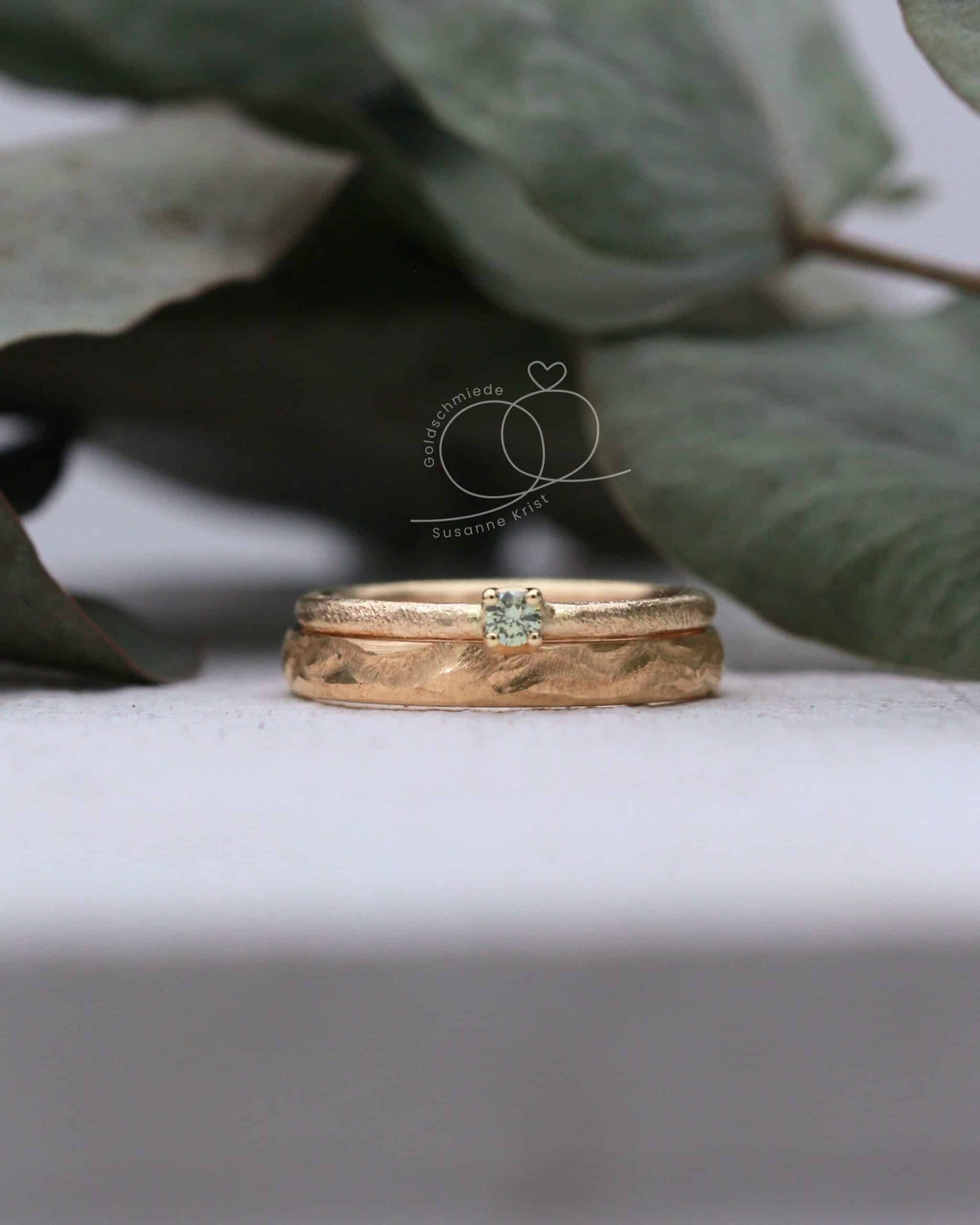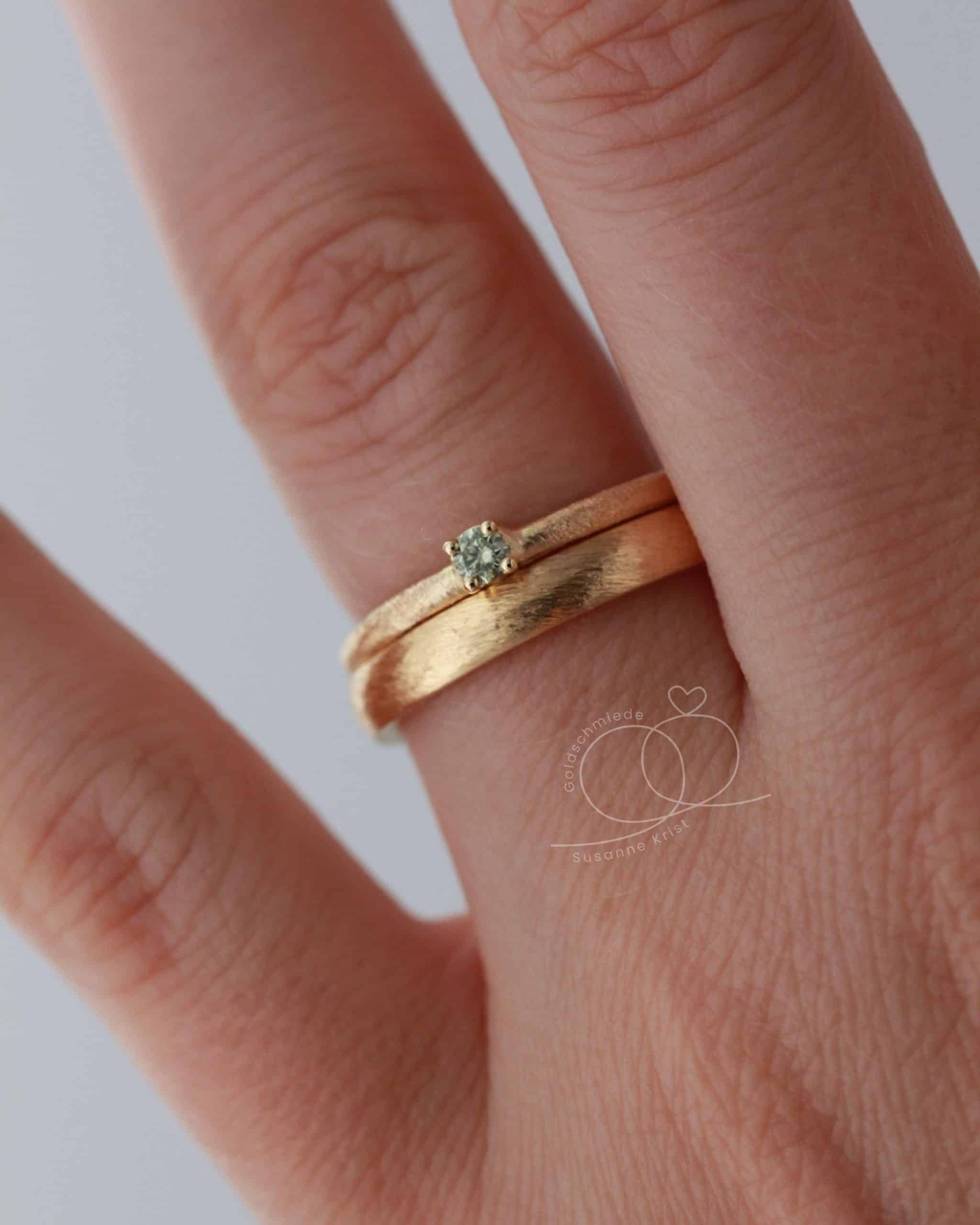 Die Kieseloberfläche ist eine aufgeraute Textur, die dem Jardini Ring ein leichtes Glitzern verleiht. Wir arbeiten sie mit verschiedenen Werkzeugen ein. Natürlich von Hand in unserer Ringmanufaktur. Die Goldfarbe wird so wunderbar betont. Die Oberfläche ist jedoch nicht kratzig und lässt sich angenehm auf der Haut tragen. Die Oberfläche ist ziemlich robust und wenn ihr sie eines Tages auffrischen lassen wollt, geht das sehr gut.