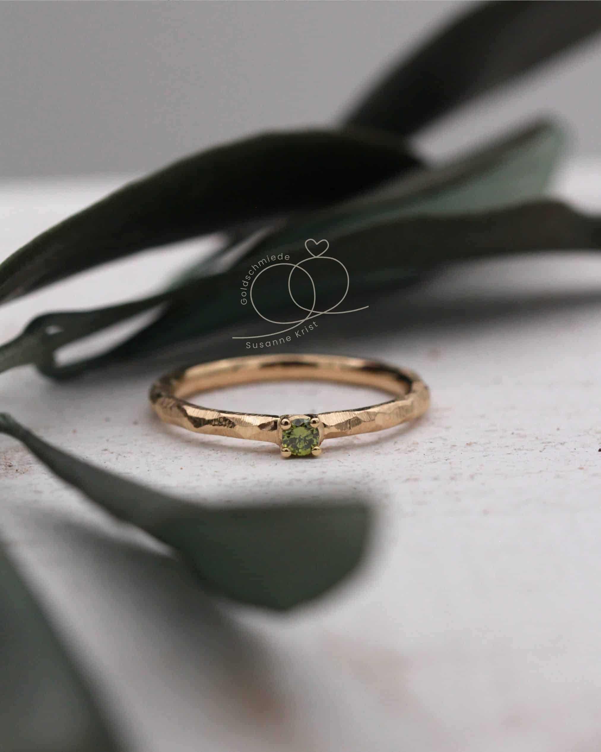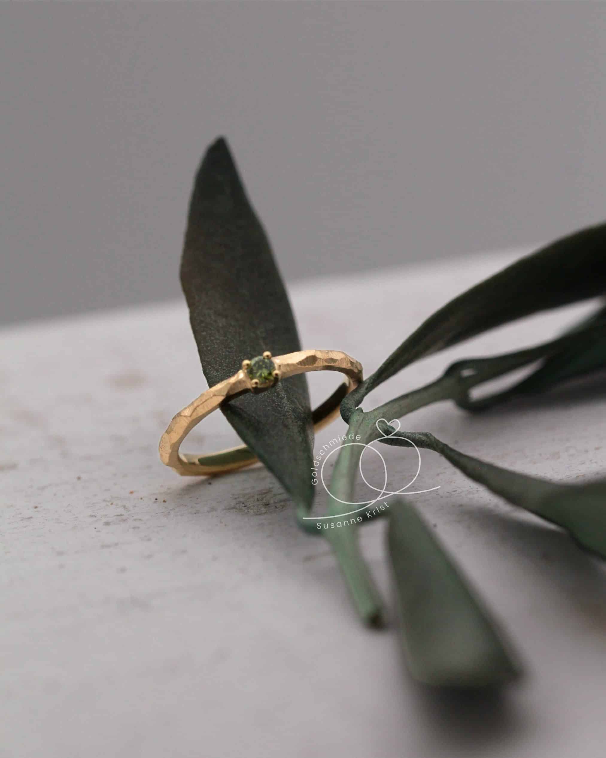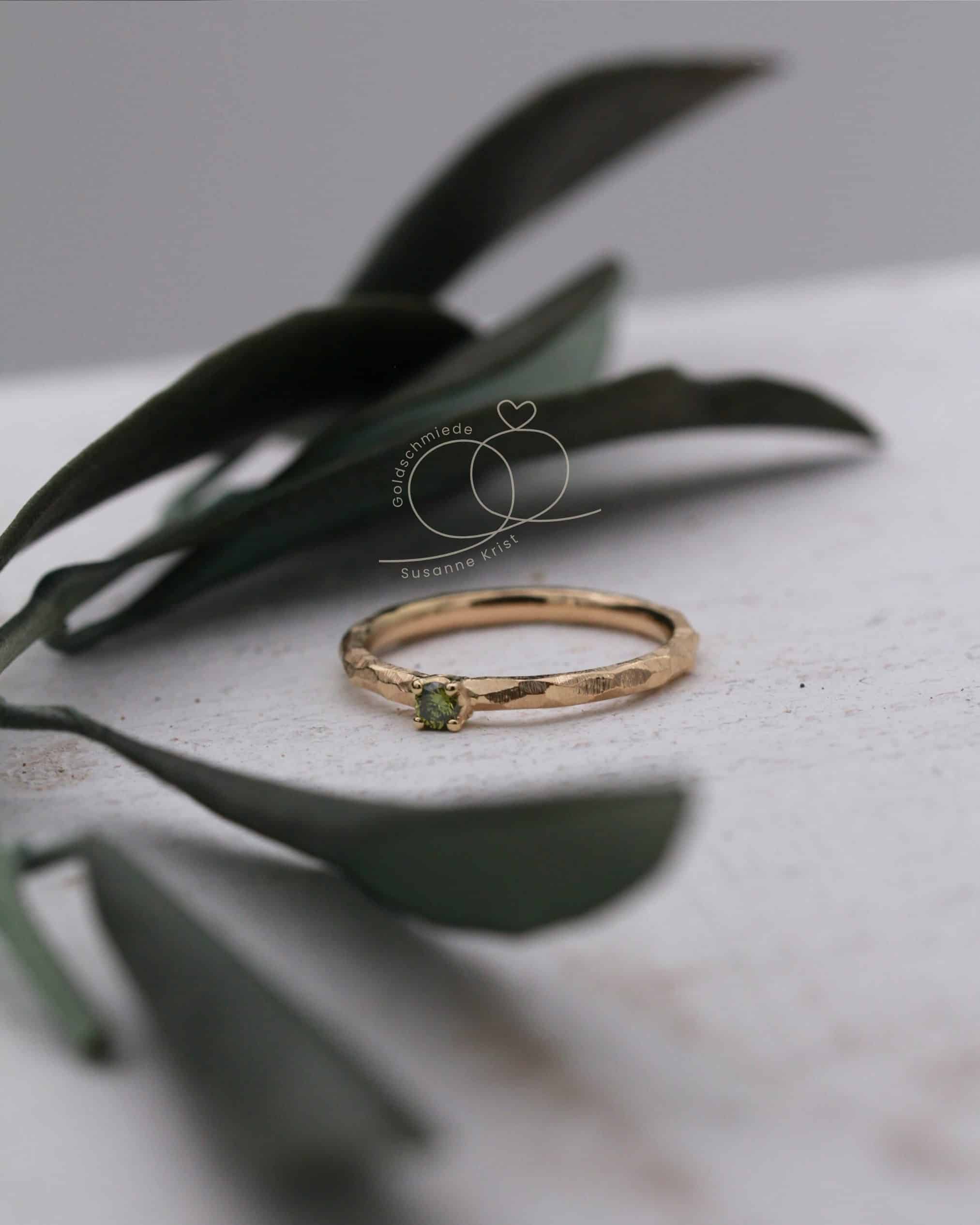 Dieser Ring ist einfach Wow! Olivi 1 ist ein wunderschöner Verlobungsring mit grünem Stein. Der Ring mit handgeschmiedeter Optik ist wie alle unsere Ringe mit viel Liebe am Werktisch angefertigt. Gerne erzählen wir dir mehr über diesen tollen floralen Vorsteckring mit olivgrünem Stein.