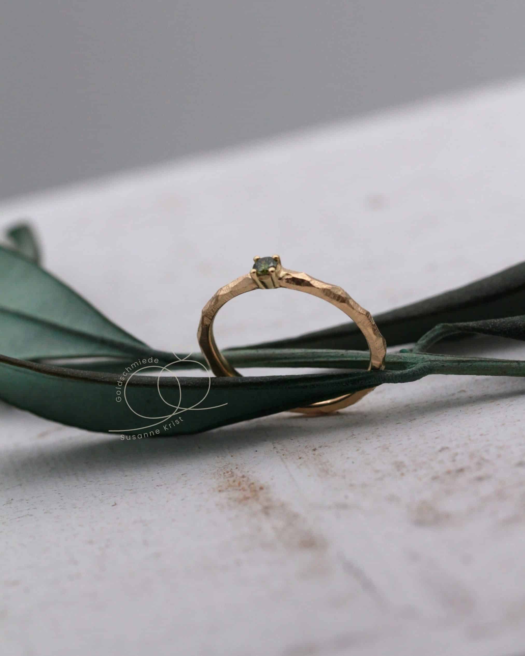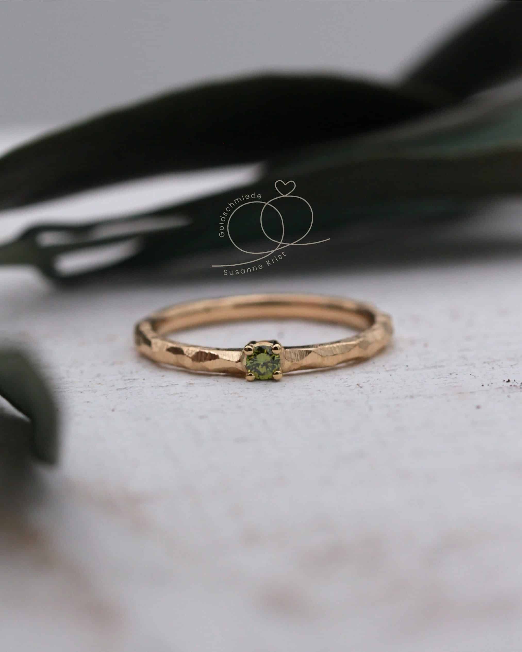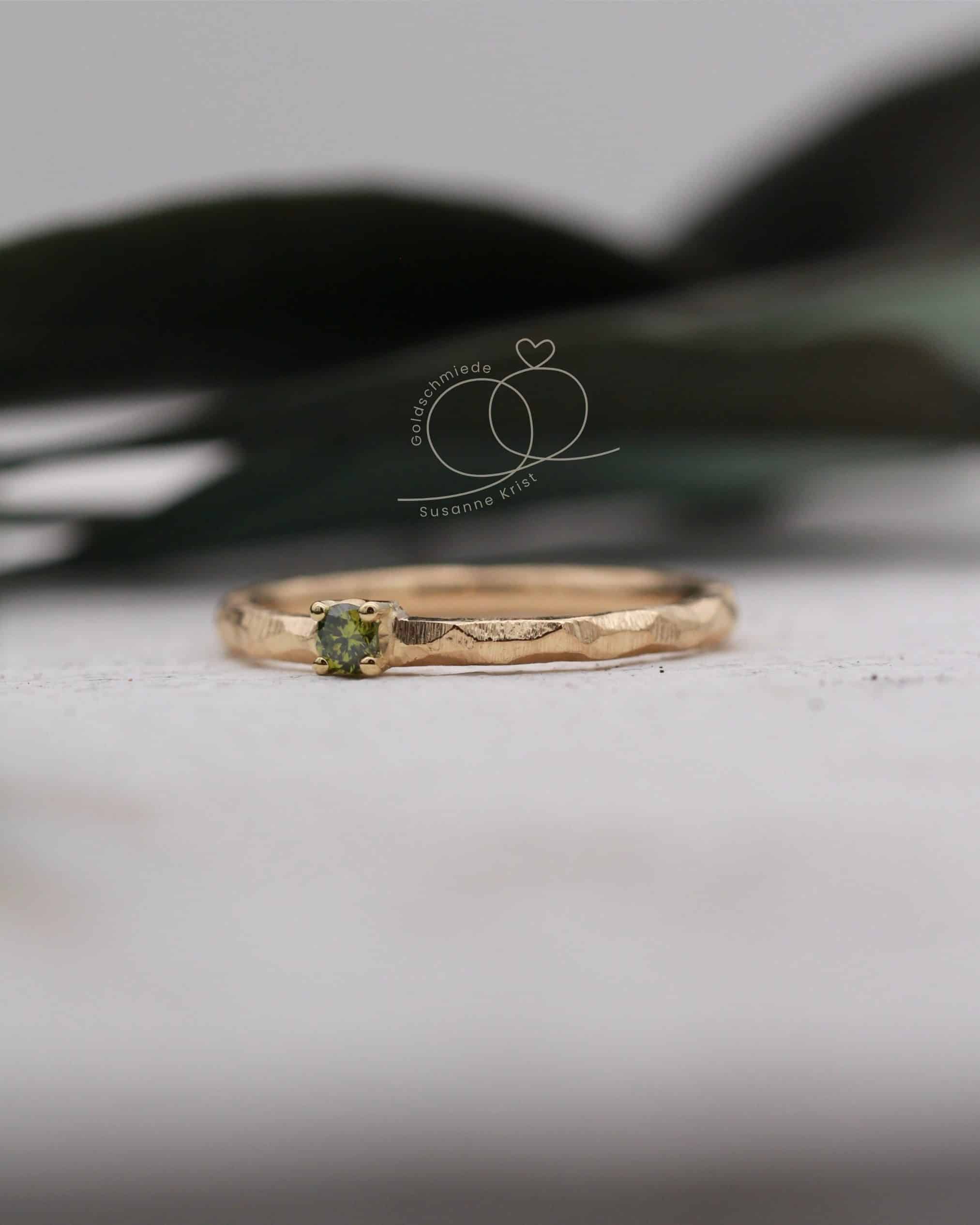 Mittig funkelt ein olivgrüner Brillant in einer Fassung mit 4 Krallen. Die Steinfarbe harmoniert sehr gut zur Farbe des Goldes.