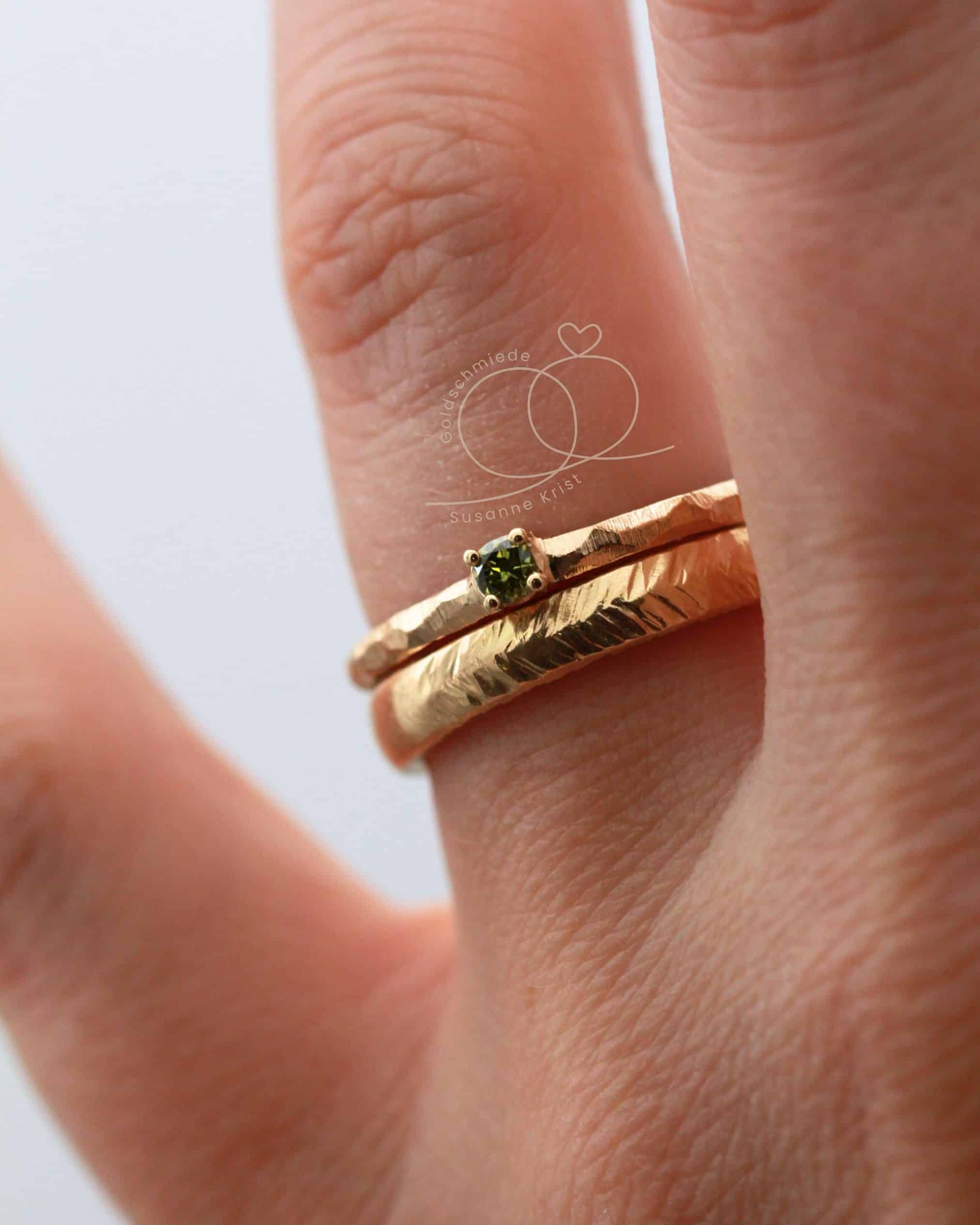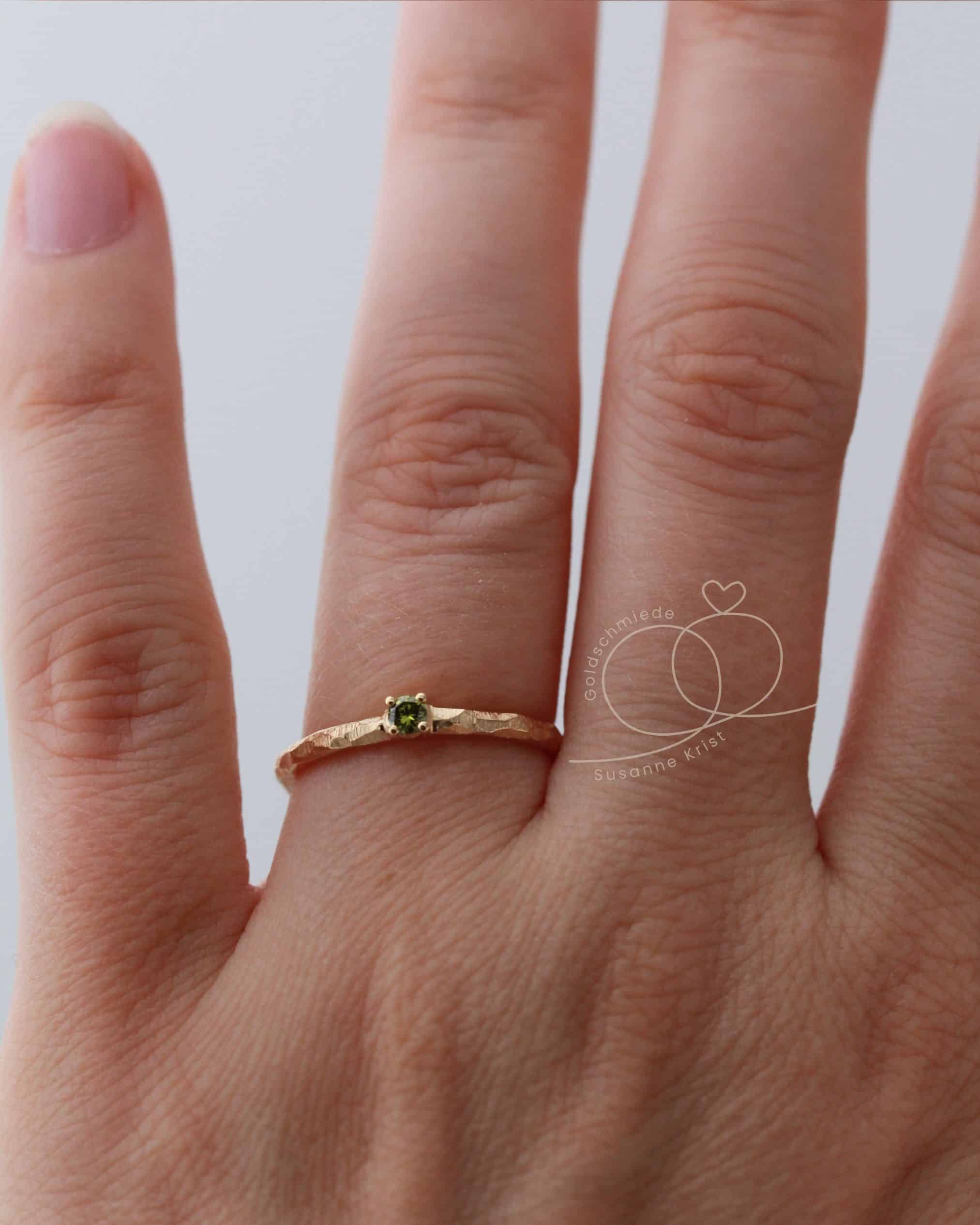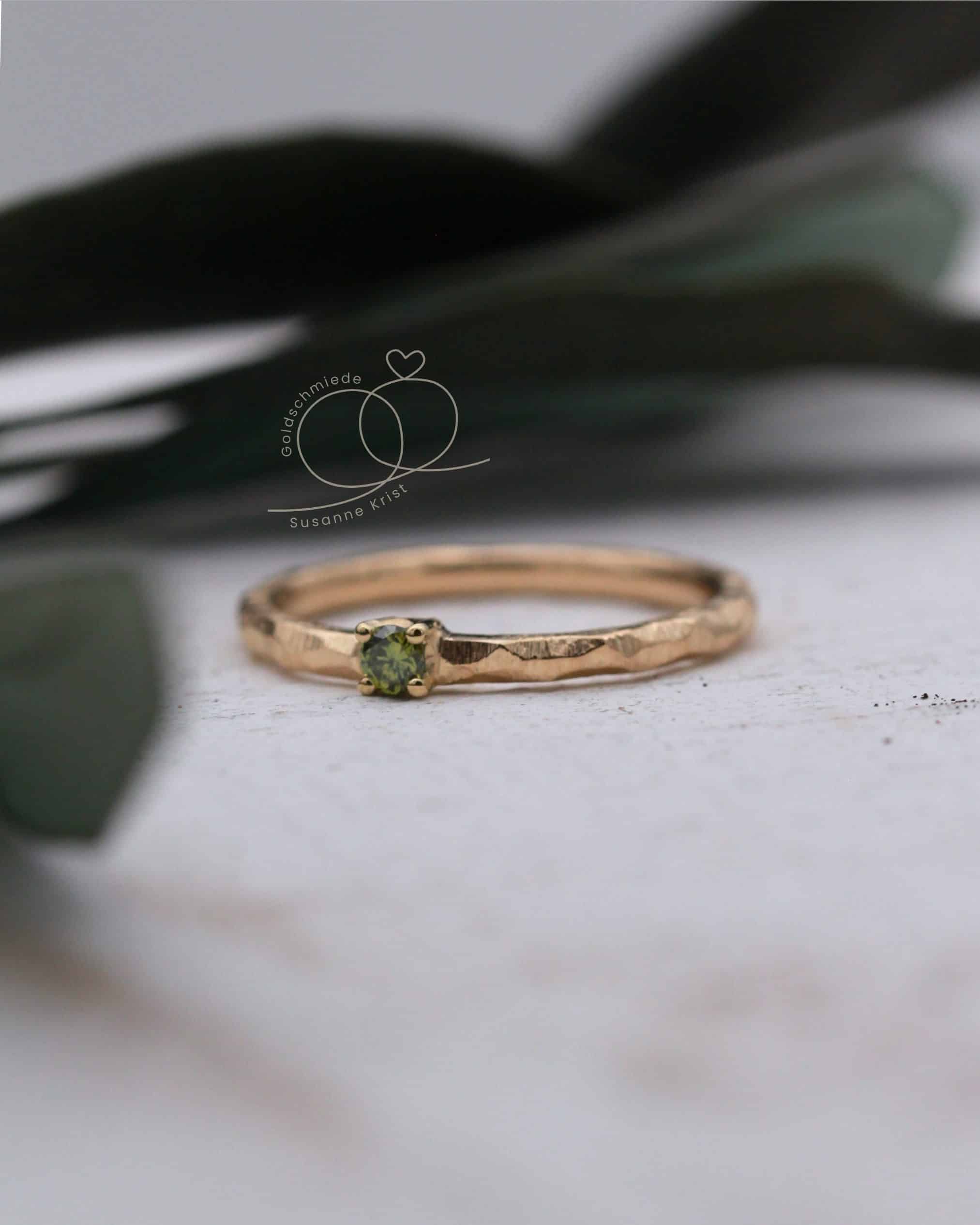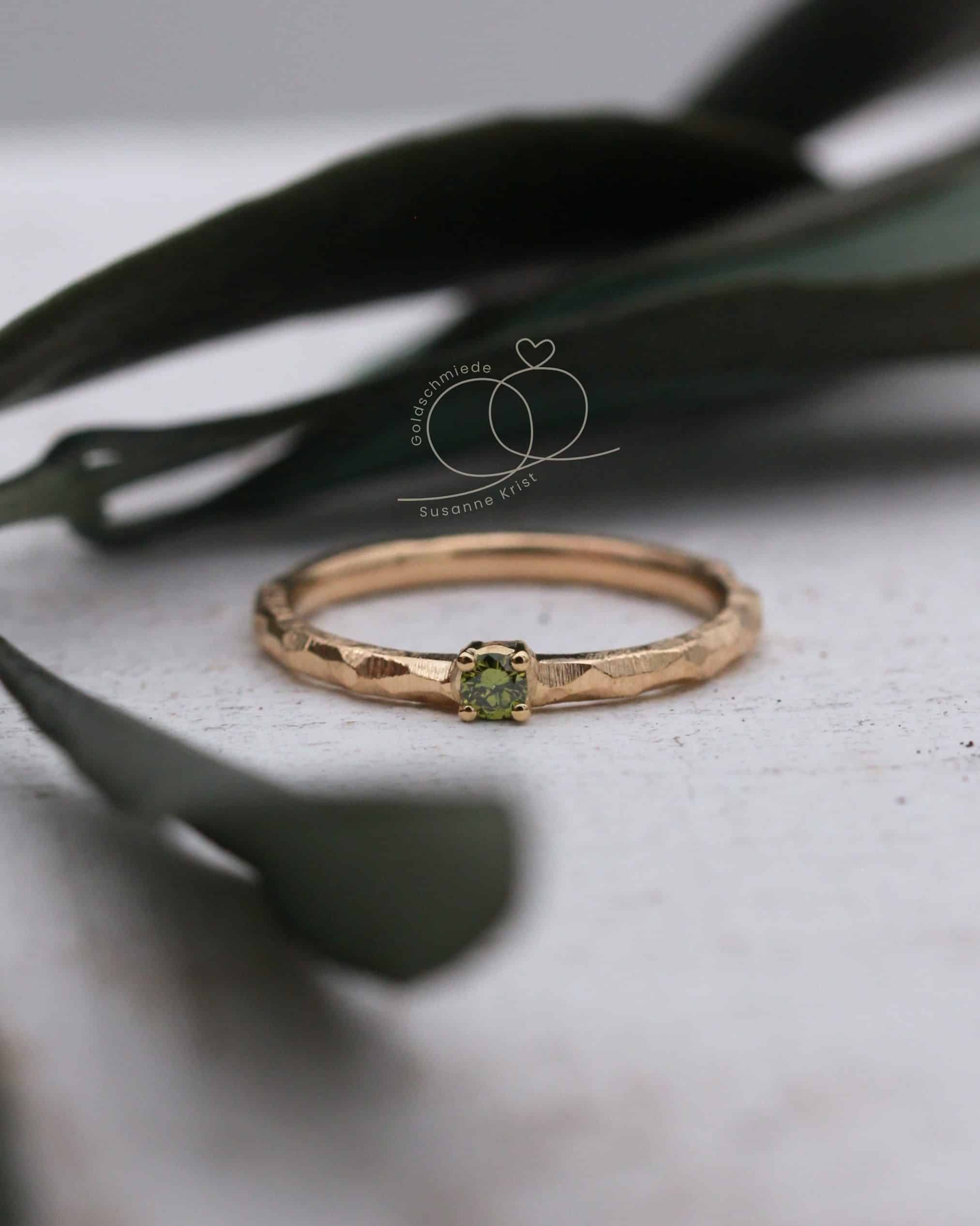 Mittig funkelt ein olivgrüner Brillant in einer Fassung mit 4 Krallen. Die Steinfarbe harmoniert sehr gut zur Farbe des Goldes.