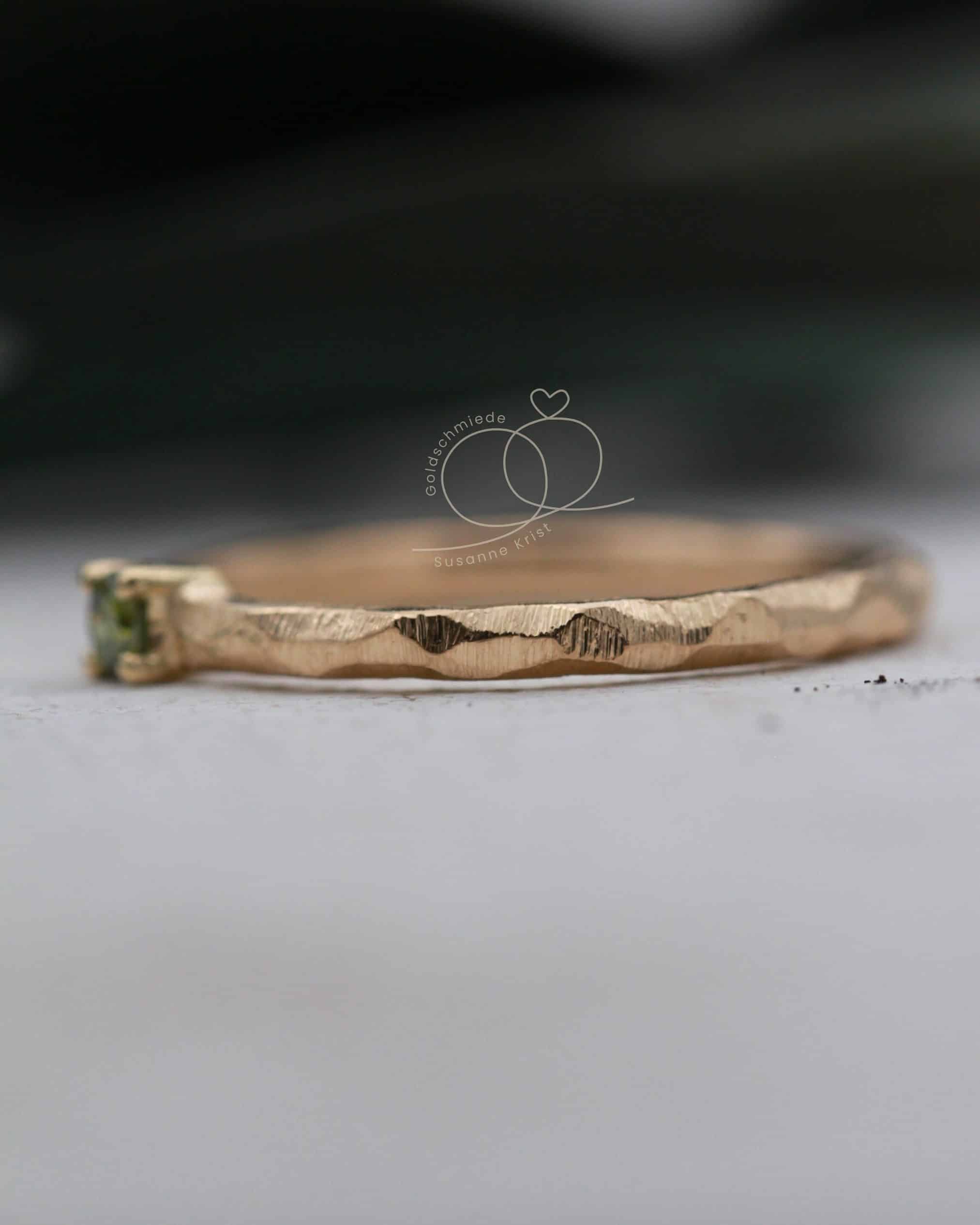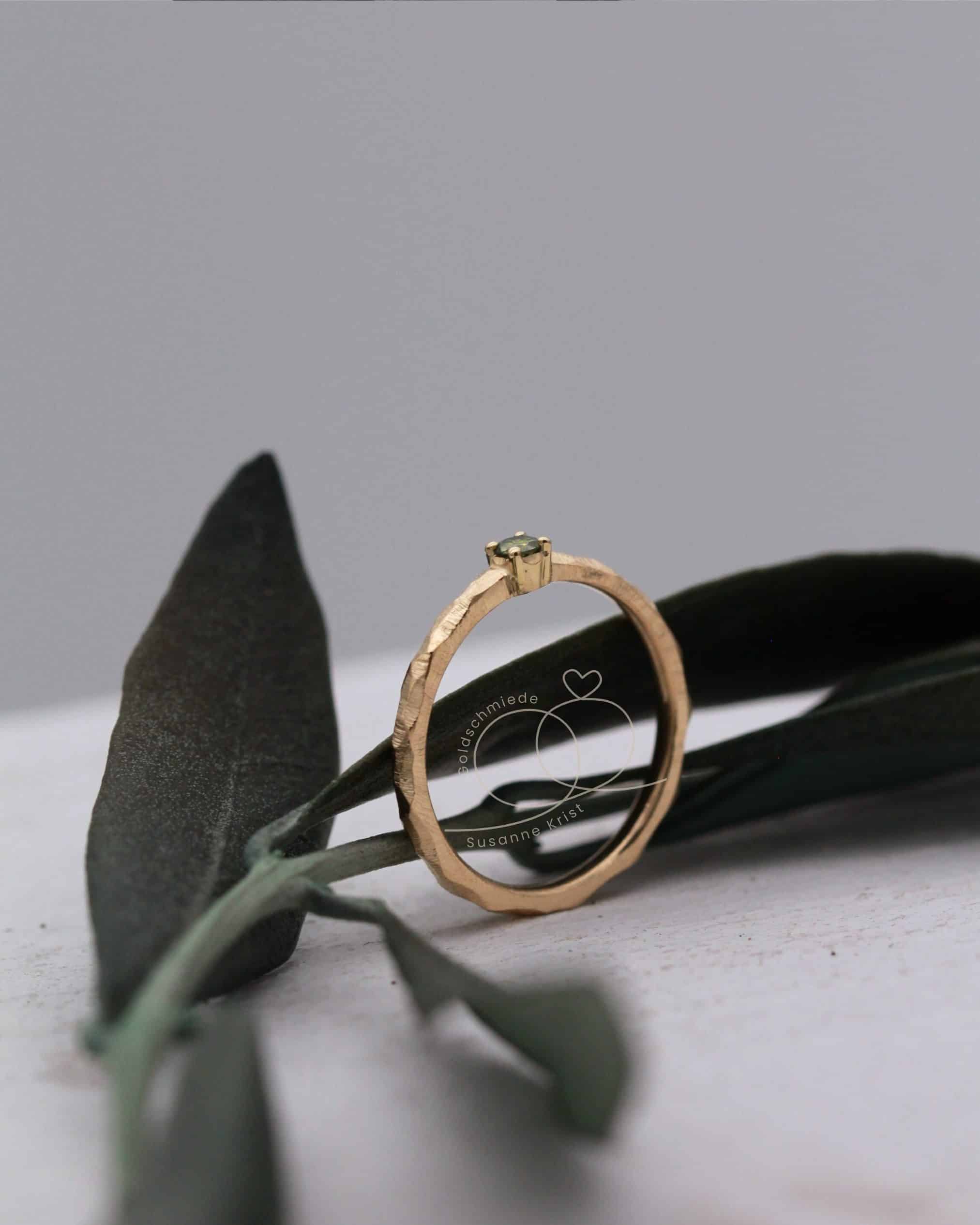 Der Verlobungsring Olivi 1 ist unter anderem einer unserer Lieblingsringe, weil er eine ganz besondere Ausstrahlung hat. Durch die Kombination von grünem Stein und der hübschen Ringoberfläche erinnert der Ring an Olivenbäume und Sommer. Ist deine Liebste ein naturverbundener Mensch und mag Grüntöne, ist dieser Ring genau richtig. Der etwas andere Verlobungsring eben.