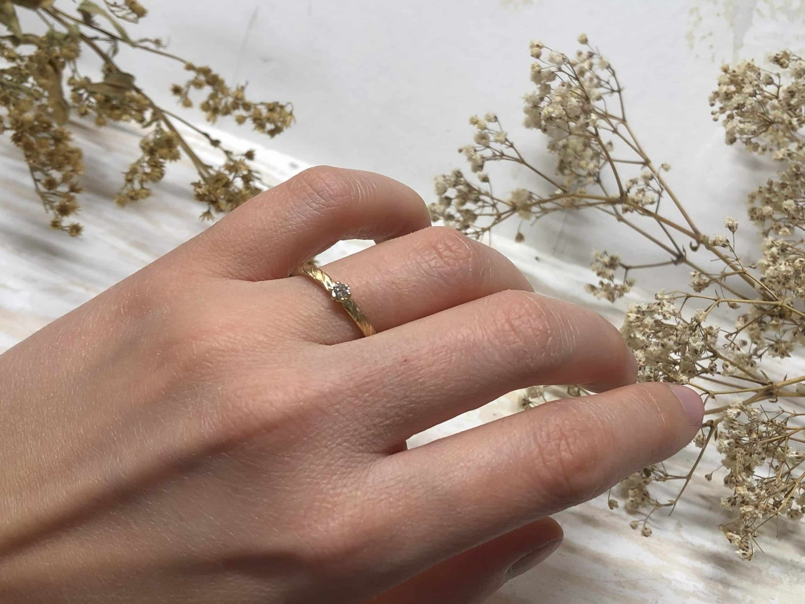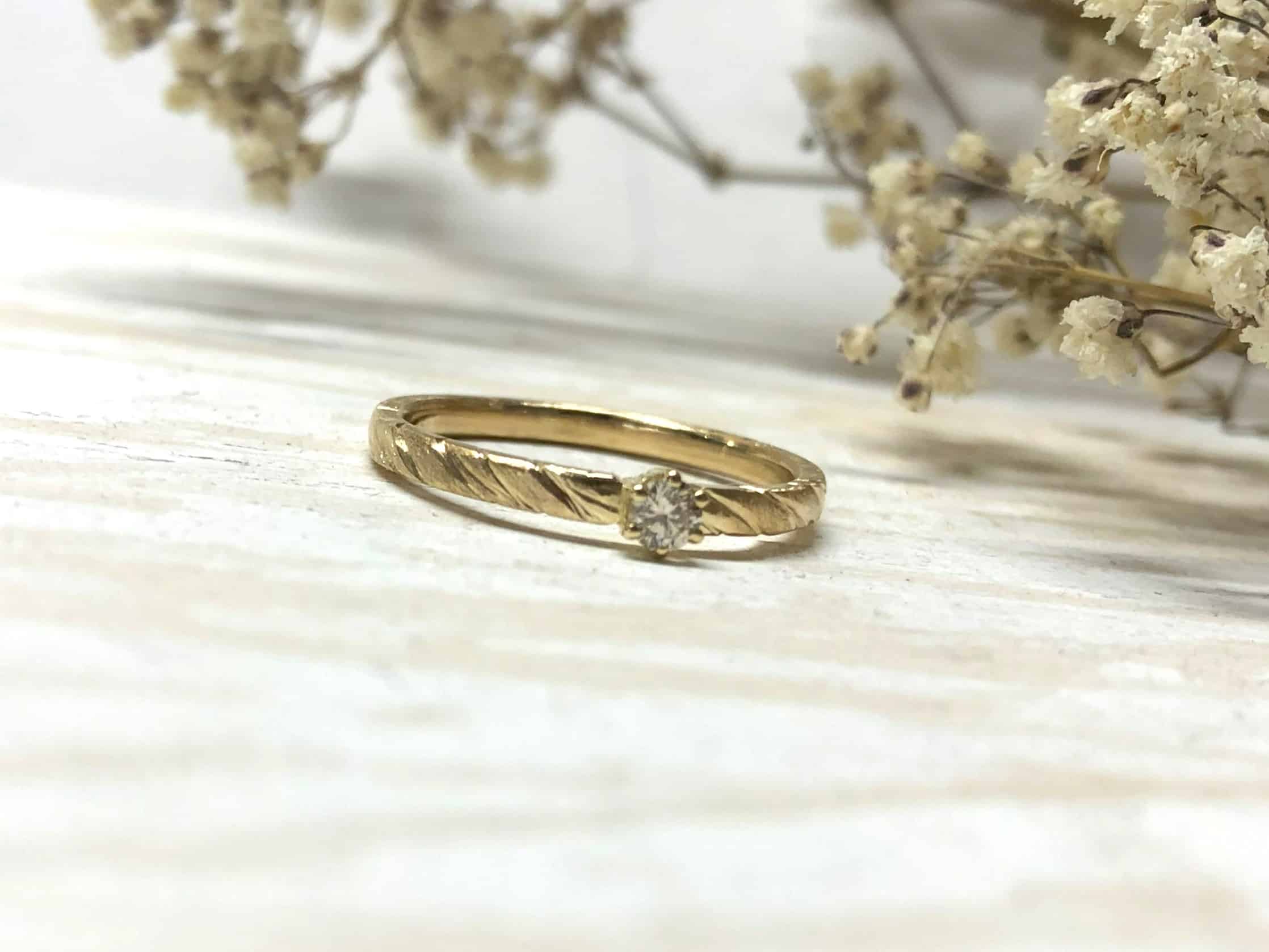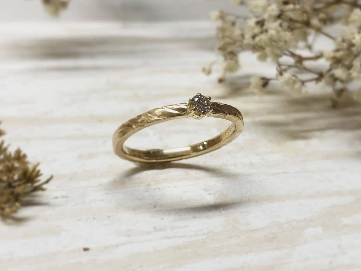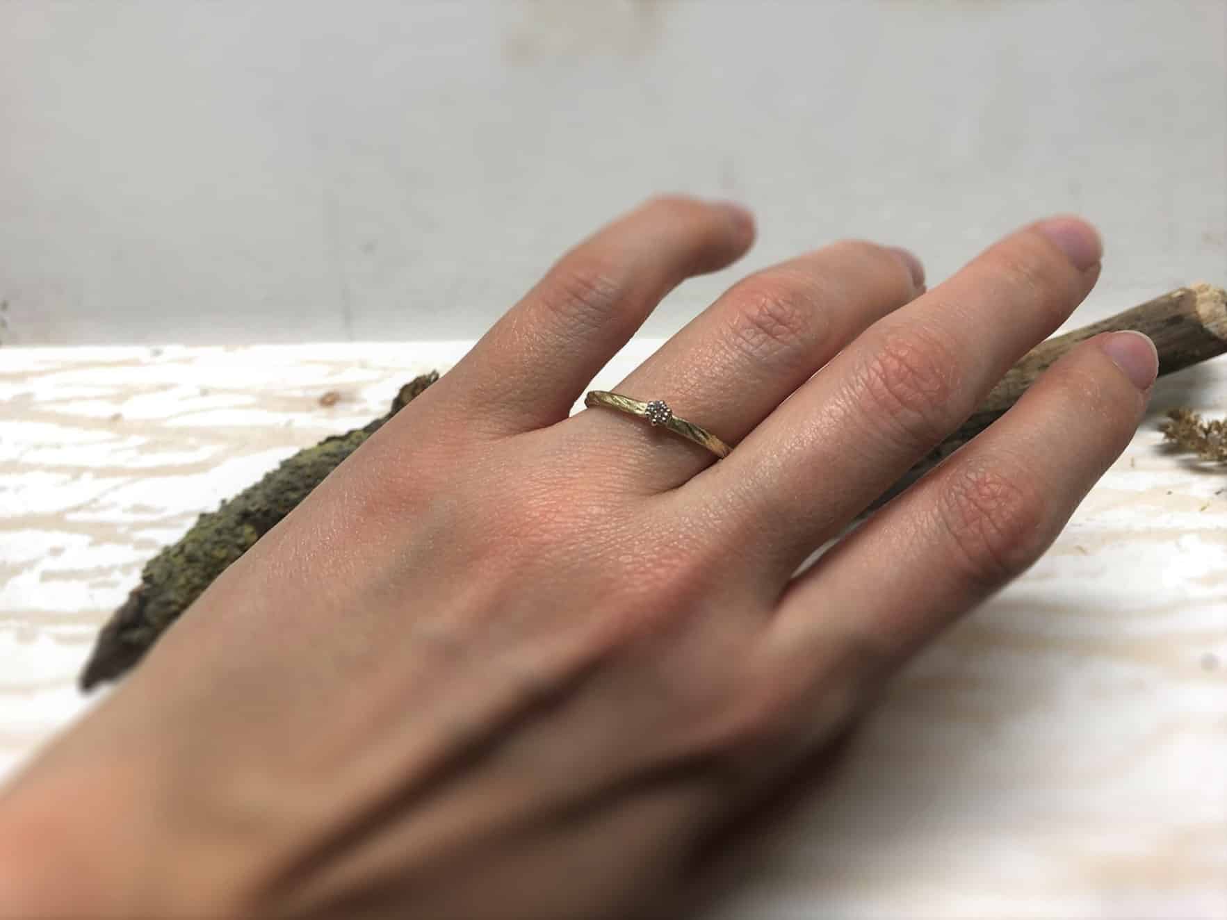 Der matte Verlobungsring Vivina ist etwas ganz Besonderes und hat ein holzartiges Ringband, das an Pflanzen und Bäume erinnert. Die Struktur wird mit unseren Goldschmiedewerkzeugen mit großer Sorgfalt eingearbeitet. Diese schöne und robuste Struktur ist auch seitlich am Ring zu finden. So entsteht ein einzigartiges Unikat.