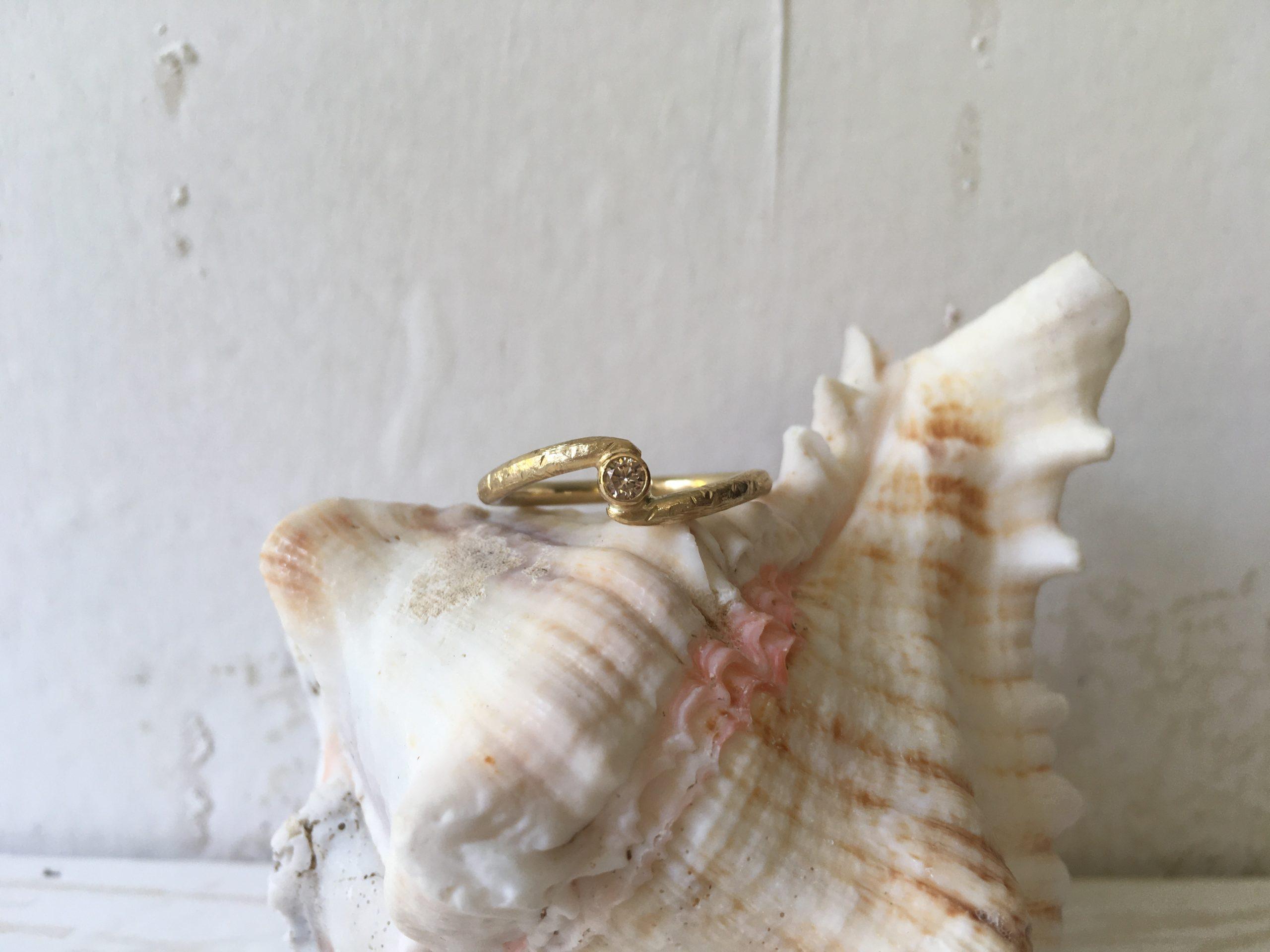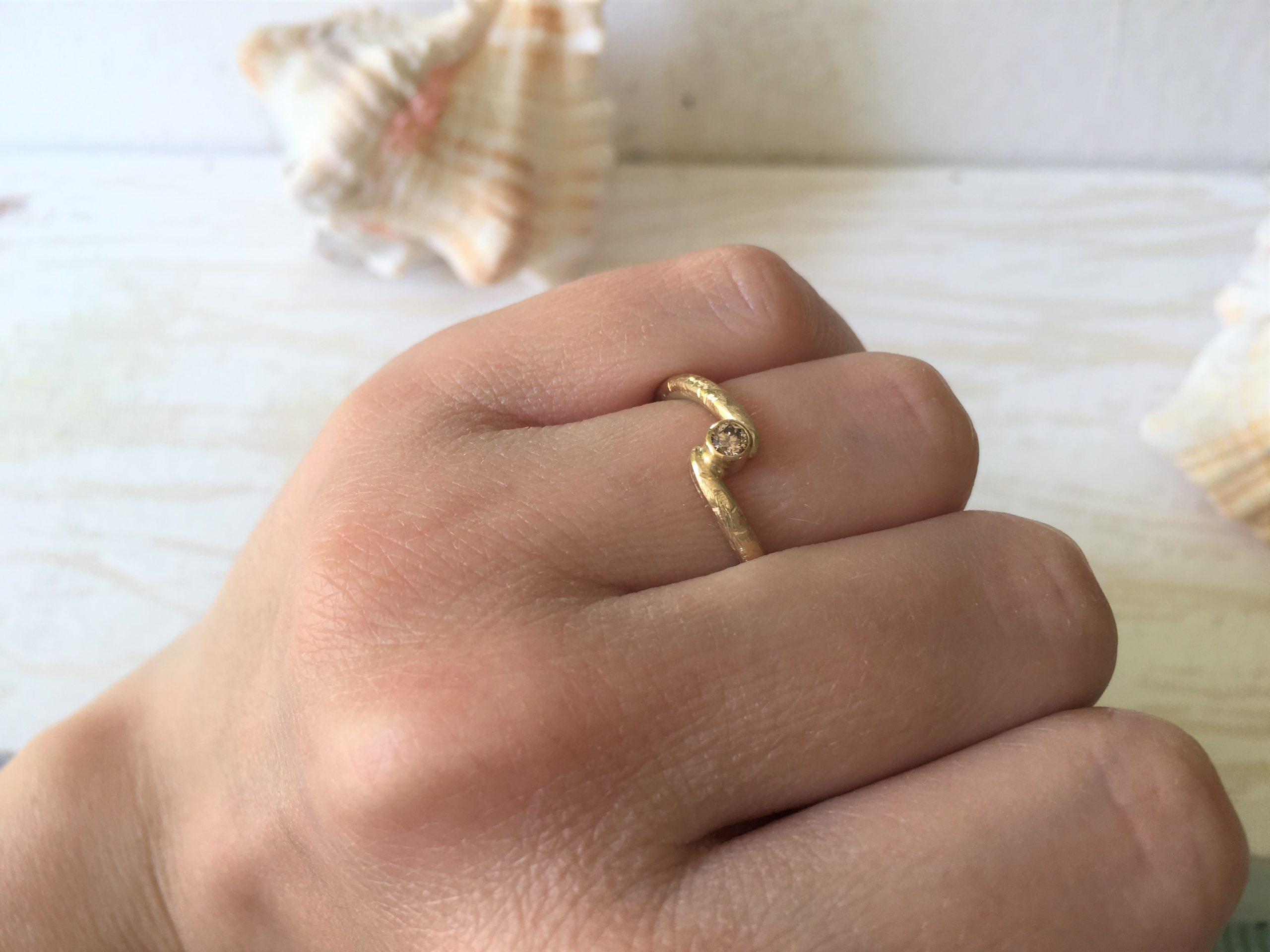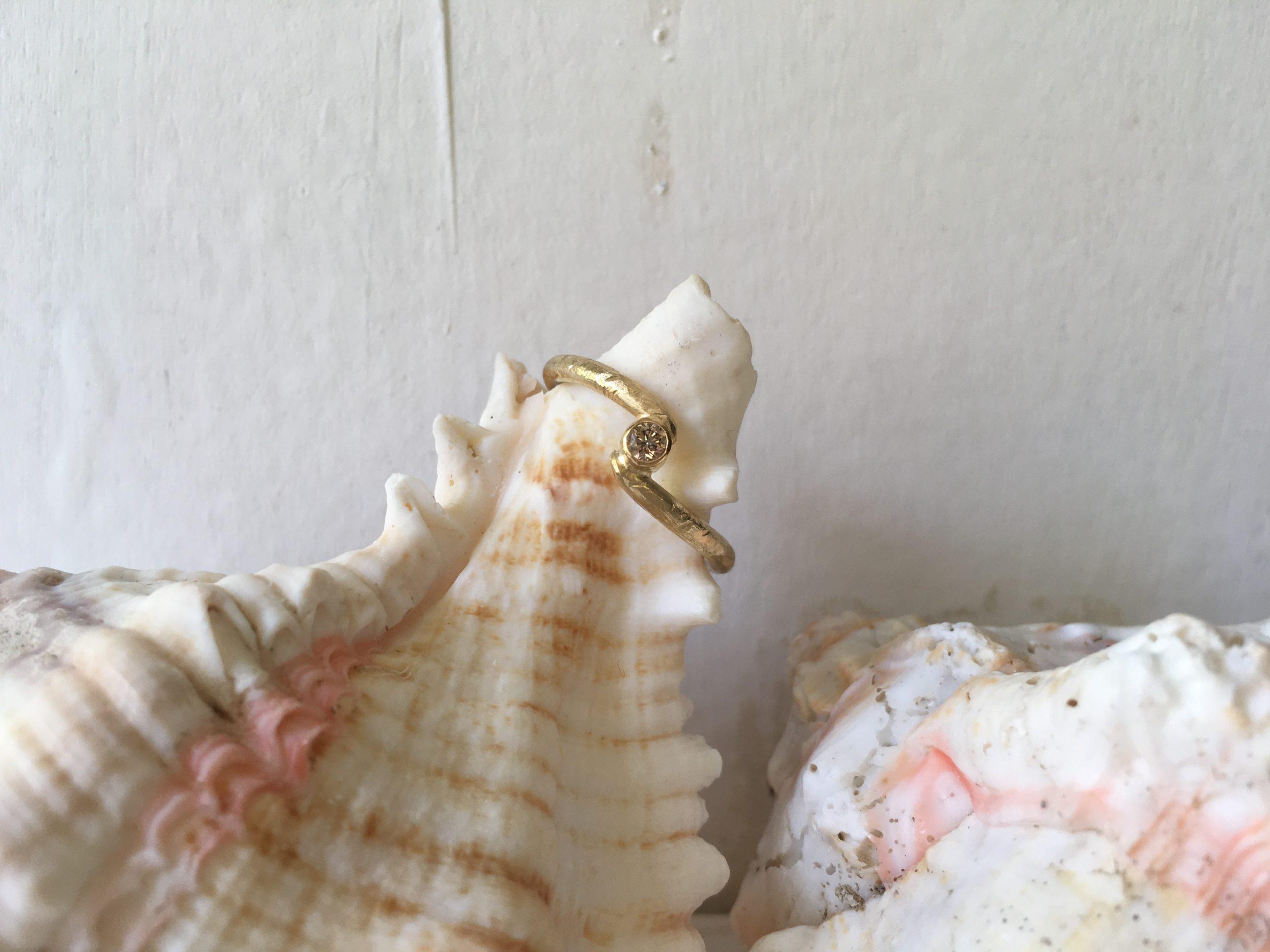 Ganz raffiniert in das verschlungene Ringband eingearbeitet, sitzt eine Fassung mit naturfarbenem Brillant. Die Fassung ist glatt und hat kleine Hammerschlagfacetten am Rand, wodurch der natürliche Charakter von Minarvi vervollständigt wird.