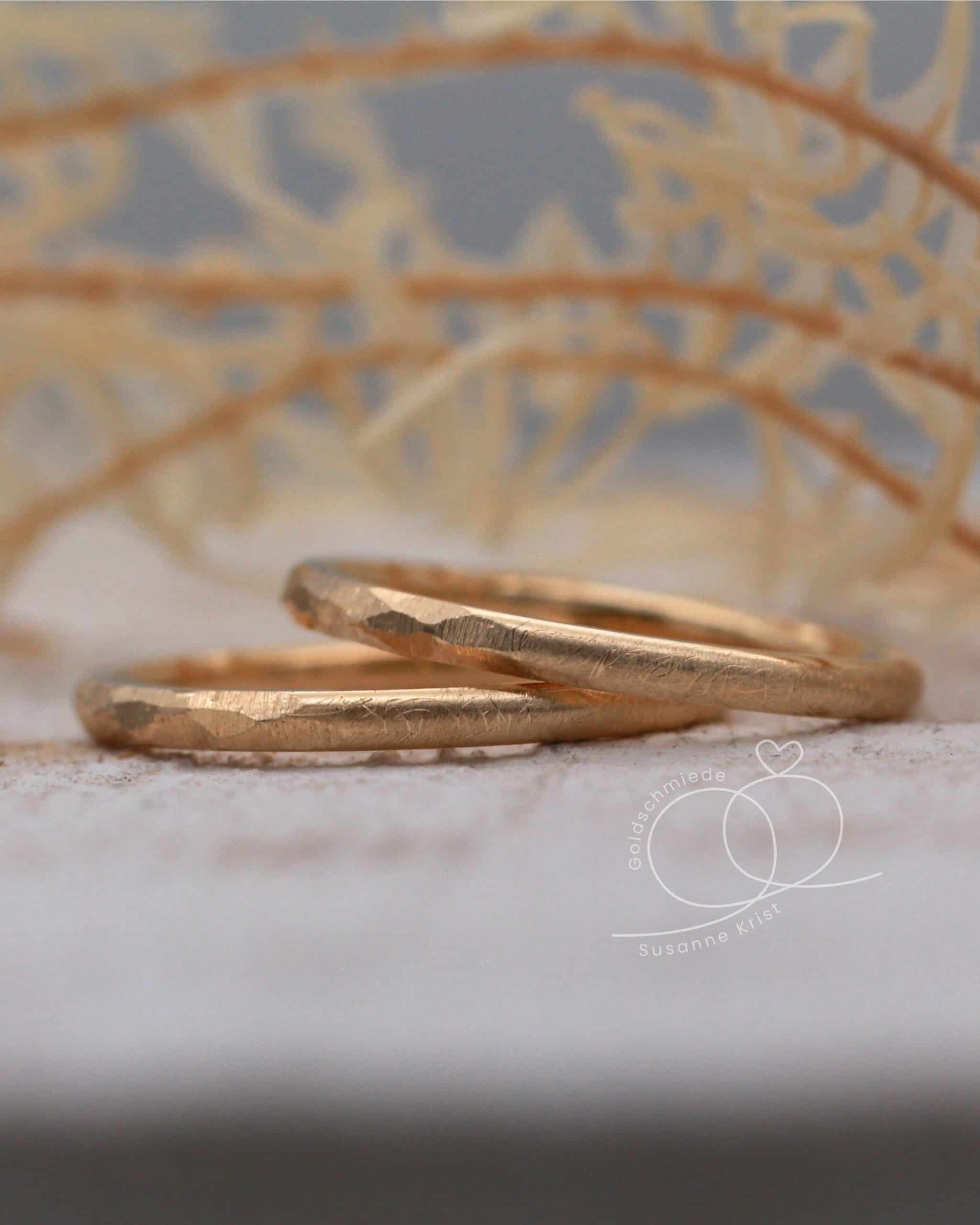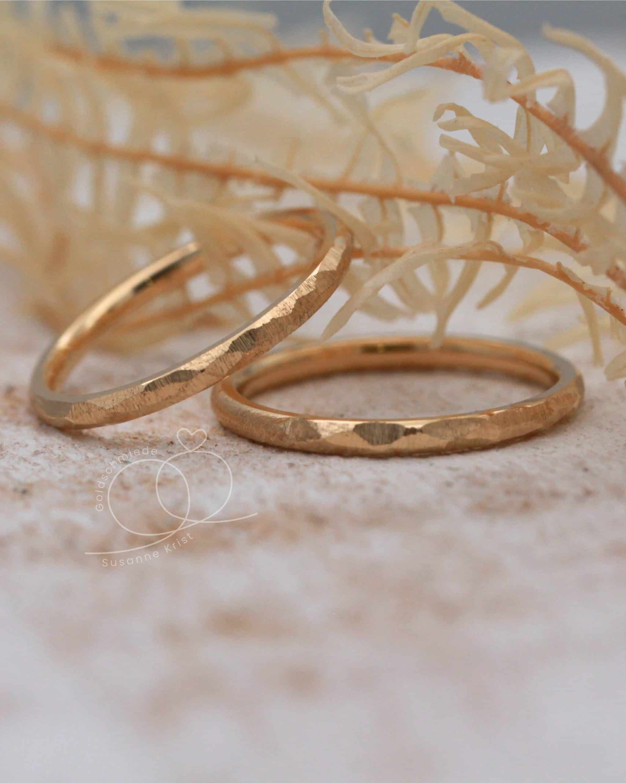 Das Besondere: Diese feinen Ringe haben zwei Texturen und nicht nur eine. Die eine Oberfläche ist eine Hammerschlag Optik namens Fels. Jede kleine Facette wird sorgfältig mit unseren Goldschmiedewerkzeugen eingearbeitet. Dadurch entsteht ein lebendiges und natürliches Facettenbild, das an Felsen und Natur erinnert. Die andere Ringhälfte ist mit einer wunderschönen Eismatt Textur bearbeitet. Diese Struktur betont die rosegoldene Farbe sehr schön und sieht klassisch aus. Somit habt ihr quasi zwei Ringe in einem an der Hand. Ihr seid ja auch zwei Hälften, die sich zu einem perfekten Ganzen zusammenfügen. Warum also nicht zwei Strukturen auf den Trauringen?